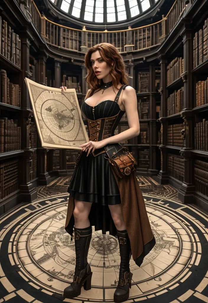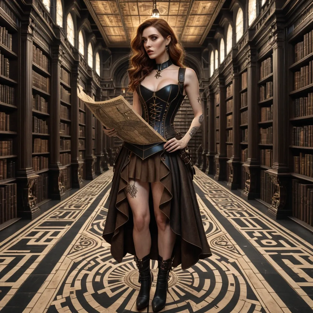 Masterpiece photorealistic full lenght , a beautiful european pale freckled 30yo female with wavy shoulder brown hair in black and bronze sleeveless steampunk corset openside dress with matching boots is standing in a giant library labyrinth escher style , she's handing a scroll map and a lantern , she looks lost , she's looking at the map. Standing toward us. fantastic cinematic style ,