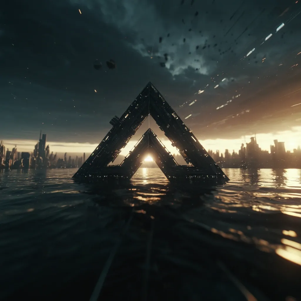 Cinematic deep space shot , camera completely locked and stationary. A massive triangle spacecraft mega-structure city built flying over space. The structure is perfectly still and unchanged , showing the entire base clearly from a wide angle. volumetric light gently cutting through the space , rich contrast with preserved shadow detail , warm highlights balanced against cool ambient tones , realistic film grain , slight halation around bright light sources , shallow depth of field , anamorphic lens look , 35mm motion picture film aesthetic , organic imperfections , moody atmosphere , frame looks extracted from a high-budget feature film. Dramatic sunset lighting over the water surface , creating highlights on the dive in air Gull-herring. High Detail , 4K , Masterpiece , Rendered in Octane , rich detailing --ar 16:9 --raw --stylize 200 ,