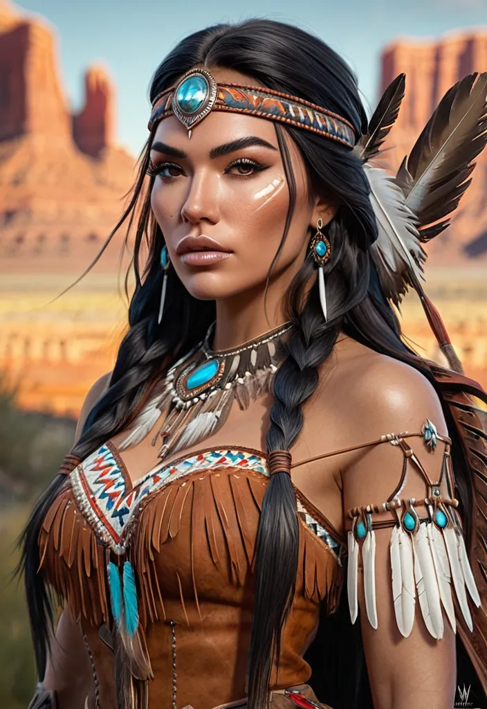mdjrny-v4 style portrait photograph of Madison Beer as Pocahontas , young beautiful native american woman , feather jewelry , traditional handmade dress , armed female hunter warrior , (((wild west))) environment , Utah landscape , ultra realistic , concept art , elegant , ((intricate)) , ((highly detailed)) , (((depth of field))) , ((professionally color graded)) , 8k , art by artgerm and greg rutkowski and alphonse mucha ,