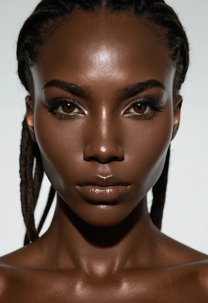 She’s a striking dark-skinned African-American woman with a face built like it was carved from confidence itself. Her cheekbones sit high and defined , giving her a powerful sculpted look that immediately commands attention. Her brown eyes are large , glossy , and intense—sharpened by dramatic eyeliner that makes her gaze feel locked-in and unshakable. Her lips are full , smooth , and shaped with a precise contour , giving her an elegant but boldly expressive look. The overall structure of her face—strong jawline , balanced symmetry , and firm expression—radiates both beauty and strength. The photo is positioned close , almost shoulder-level , framing her from the top of her head down to just above her chest. Her long brown dreadlocks fall forward and frame her face , creating a dramatic , almost regal halo effect around her features. The camera angle is centered and direct , placing her eyes at the focal point so the viewer meets her gaze instantly. It’s a tight , intimate portrait meant to highlight her facial power , her intensity , and the commanding presence she carries without saying a word. ,