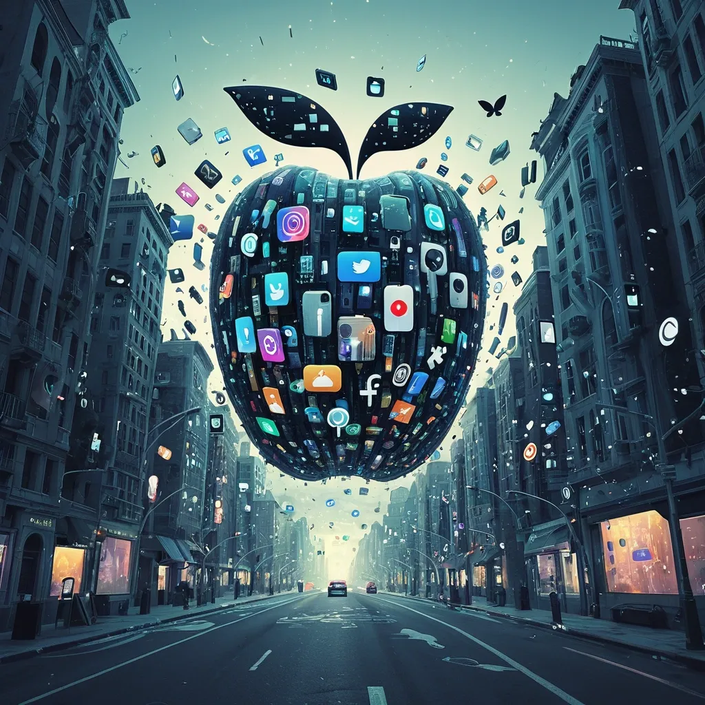 A whimsical cityscape constructed entirely from oversized , iPhone screes , with all apps icons fluttering in a gentle breeze like icons. Road of social-media icons flow through the streets , and streetlights are shaped like glowing apple logo. derelict alien vessel that resembles a skeletal whale fly between the iPhone-buildings. This is rendered in a surreal , abstract style , focusing on the unexpected juxtaposition of elements and a dreamlike atmosphere , reminiscent of fine art iPhone illustrations. ,