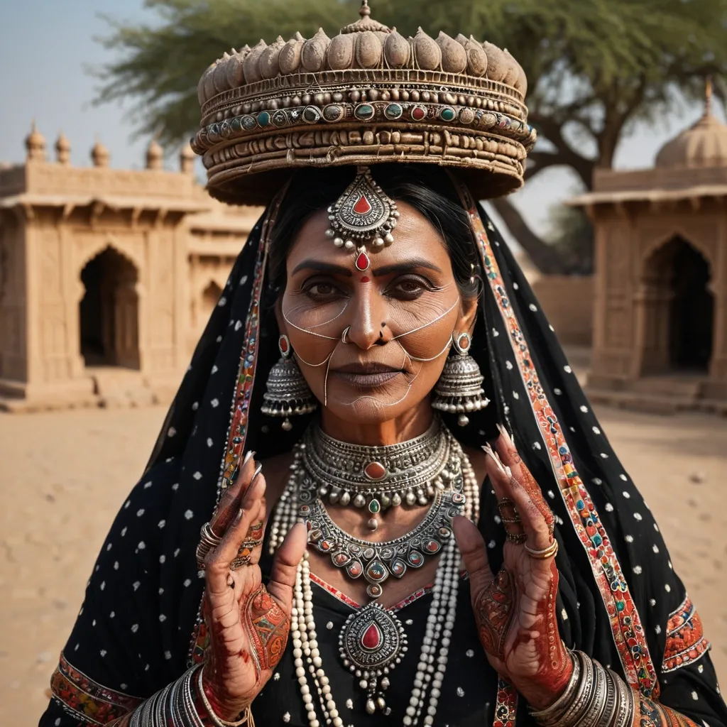 High-resolution and ultra-photorealistic photograph , Such large , intricately carved shrines are still seen in many villages of Kutch. a beautiful contrast of colors the a poised young Kutchi woman , emerge from the shrines. her dusky skin and honey-blonde hair contrasting with the black embroidered fabric partially concealing her head and lower face. Adorned in heavy , ornate silver jewelry , including a large traditional Kutchi necklace and metallic bangles , she grasps a giant , grassy bundle on her head with one hand. The walls made of stones , the Gokh on the left side of the shrine , it is a joy to see that a little bit of culture is still left in Kutch. The atmosphere is dense and smoky , with a soft bokeh blur in the background. Subtle cinematic granularity , low depth of field , captured with a 50mm anamorphic lens , f/1.8 , ISO 400. Saturated colors with a touch of sepia to evoke nostalgia ,