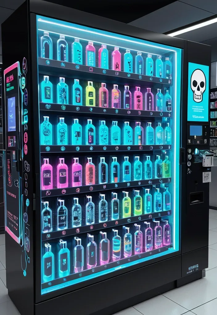 Modern vending machine with a touchscreen display (buttons in body in ) showing QR payment options. Visible products nicely organized and metallic vials containing shaped like a lethal glass skull , neon-colored energy serums. Holographic schematics flicker above , detailing complex molecular structures. ,