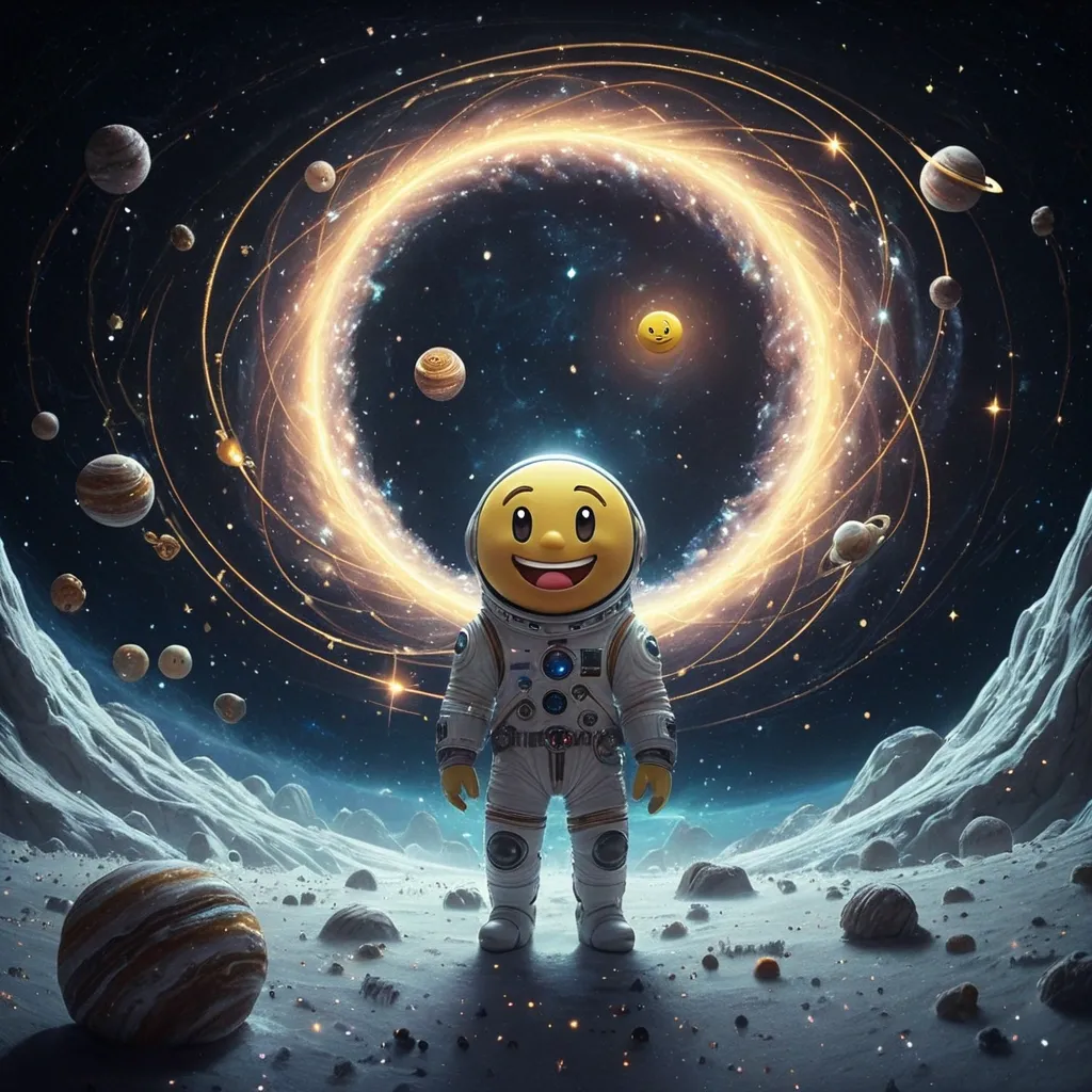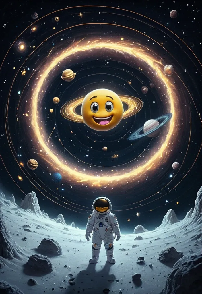 A colossal , ancient happy emoji (yummy smile) with Saturn's ring , surrounding emoji and floats serenely in a cosmic void , its white wool skin from nebulae and constellations. Miniature astronauts , akin to mythological heroes , are tethered to its fleece , exploring its starry expanse. The scene is rendered in a dramatic , dark fantasy concept art style , emphasizing the immense scale and cosmic wonder. he atmosphere is thick with interstellar dust , and beams of distant starlight pierce through , casting an enchanting glow around them , swirling galaxy , expressing a deep sense of contemplation and wisdom. The atmosphere is thick with interstellar dust , and beams of distant starlight pierce through , casting an enchanting glow around them. This scene would be beautifully rendered in cinematic lighting , evoking feelings of wonder and cosmic significance. ,