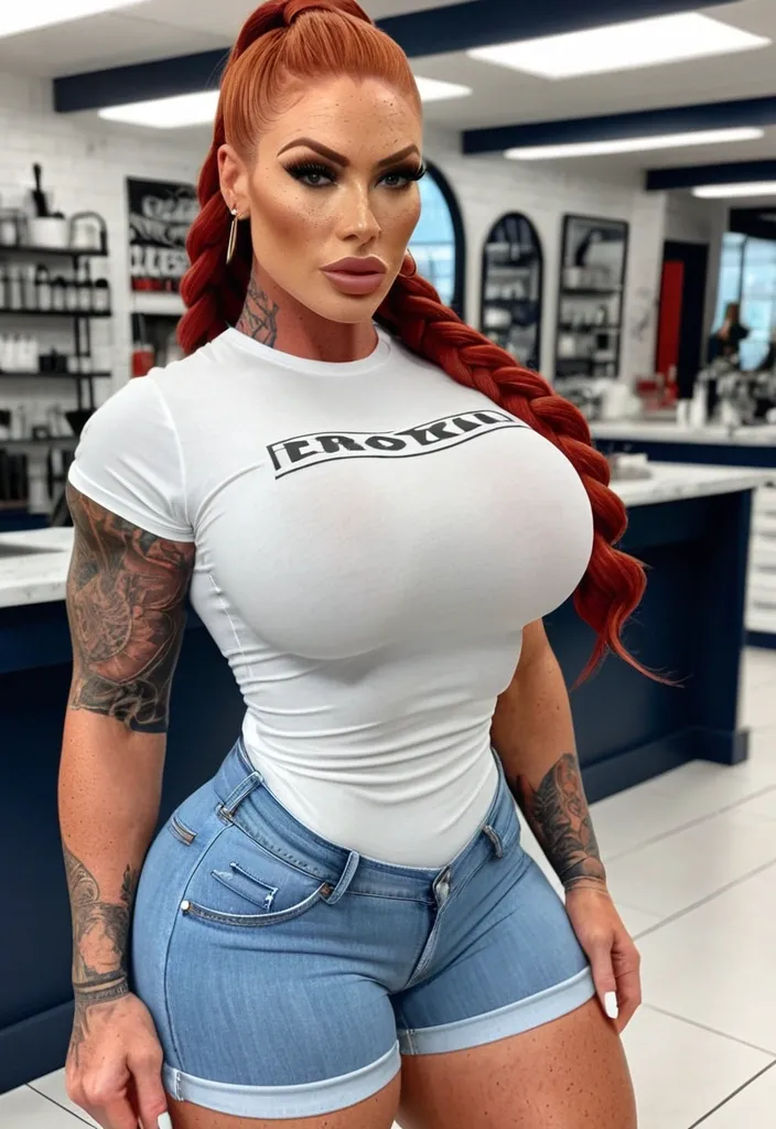 À giant muscular chubby most busty femalebodybuilder , housewife woman BBW musclée , heavy weight bodybuildeuse géante et plantureuse with giant chest , imposante dame massive , beautiful make up Kate Hudson face , in a police station office , avec de gros seins , énormes biceps musclés , in white laces transparent very short mini loose nightgown with heels , exposant les seins , bras musclés exposés , dominante , jambes massives exposées , agressive , ,
