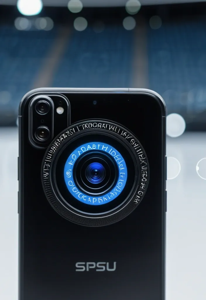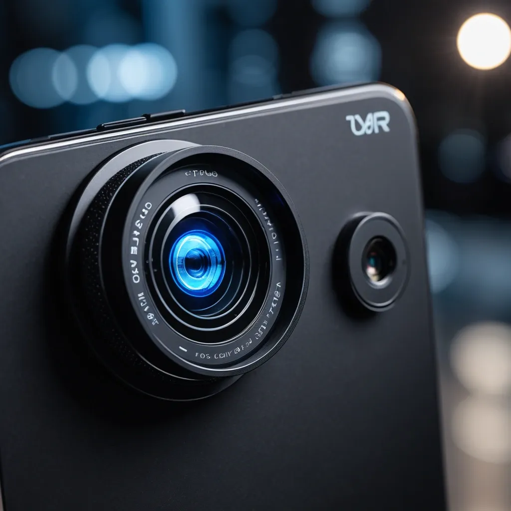 Un primer plano fotorrealista de un lente óptico inteligente para celular , de color negro mate y diseño elegante , que se engancha con facilidad a la lente de la cámara de un smartphone de alta gama. El lente inteligente tiene un acabado metálico texturizado y un anillo central de vidrio óptico transparente y brillante , con un pequeño indicador LED azul que parpadea suavemente para indicar su funcionamiento. Se muestra adjunto a la cámara trasera de un teléfono inteligente moderno , revelando el logotipo de una marca ficticia de tecnología inteligente grabada en el borde del lente. En el fondo , se aprecia una escena de fotografía profesional con un trípode y equipo de iluminación , desenfocada pero visible , sugiriendo la calidad y el potencial de uso profesional del lente óptico inteligente. ,
