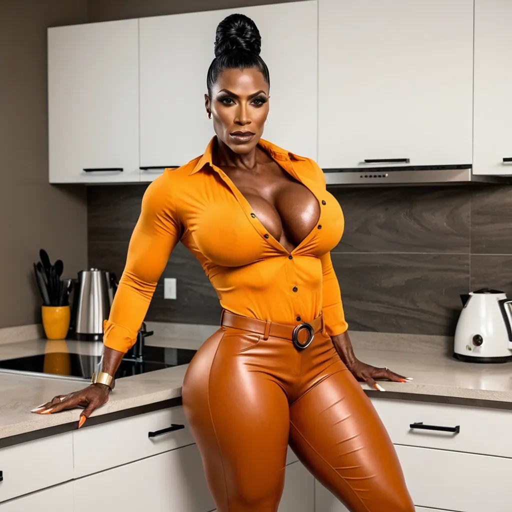 42 years old , dark-skinned African-American woman — extremely beautiful , with a presence that feels quietly dangerous and quietly royal at the same time. She has that soft glow in her skin that looks effortless , like she wakes up looking like this every day without trying , but everyone knows she still probably puts in discipline the old fashioned way. Her bone structure is model tier… cheekbones that could cut through pride , a jawline that says she doesn’t bend for just anybody , and soft lips that hold mystery and restraint all at once.Her futuristic hairdo , cropped close , styled in textured waves that shape her face like an artist’s finishing brush stroke. It gives her a striking , modern elegance — feminine , but with that slight edge that tells you she’s not the type anyone ever controls. Her eyebrows are naturally bold and shaped sharply , framing her honey hazel eyes that practically glow with their own weather system. Those eyes… you could lose a fight in those eyes before she ever speaks a word.She has luminous , glossy skin that reflects light like polished bronze catching early morning sun. Natural freckles sprinkle just lightly across her cheeks , softening the intimidation factor with a hint of youthful innocence. The way the light hits her face makes her look sculpted — like an ultra realistic painting brought to life. Everything about her looks intentional… but also like she was born this way.There’s also this quiet calm in her expression — not emotional weakness — but a poised , unshakeable stillness that only comes from knowing exactly who you are and not needing to defend it. She looks like the woman who never rushes into noise… she waits , she observes , she lets the room shift around her while she remains unmoved. That alone is power — and she wears it naturally like an old soul who understands her worth in ways other people are still scrambling to figure out , blonde short short futuristic pompadour hair , muscular body builder woman , , enormous breast , enormous buttThe low-cut top emphasizes her posture , drawing attention to her chest as she gazes directly ahead. standing in kitchen , enormous butt , , Enormous breast , facing camera , modest top , button up shirt , closed collar , modest collar orange , brown , and beige accent modest shirt , beige leather pants , closed collar top , yellow undershirt t-shirt ,
