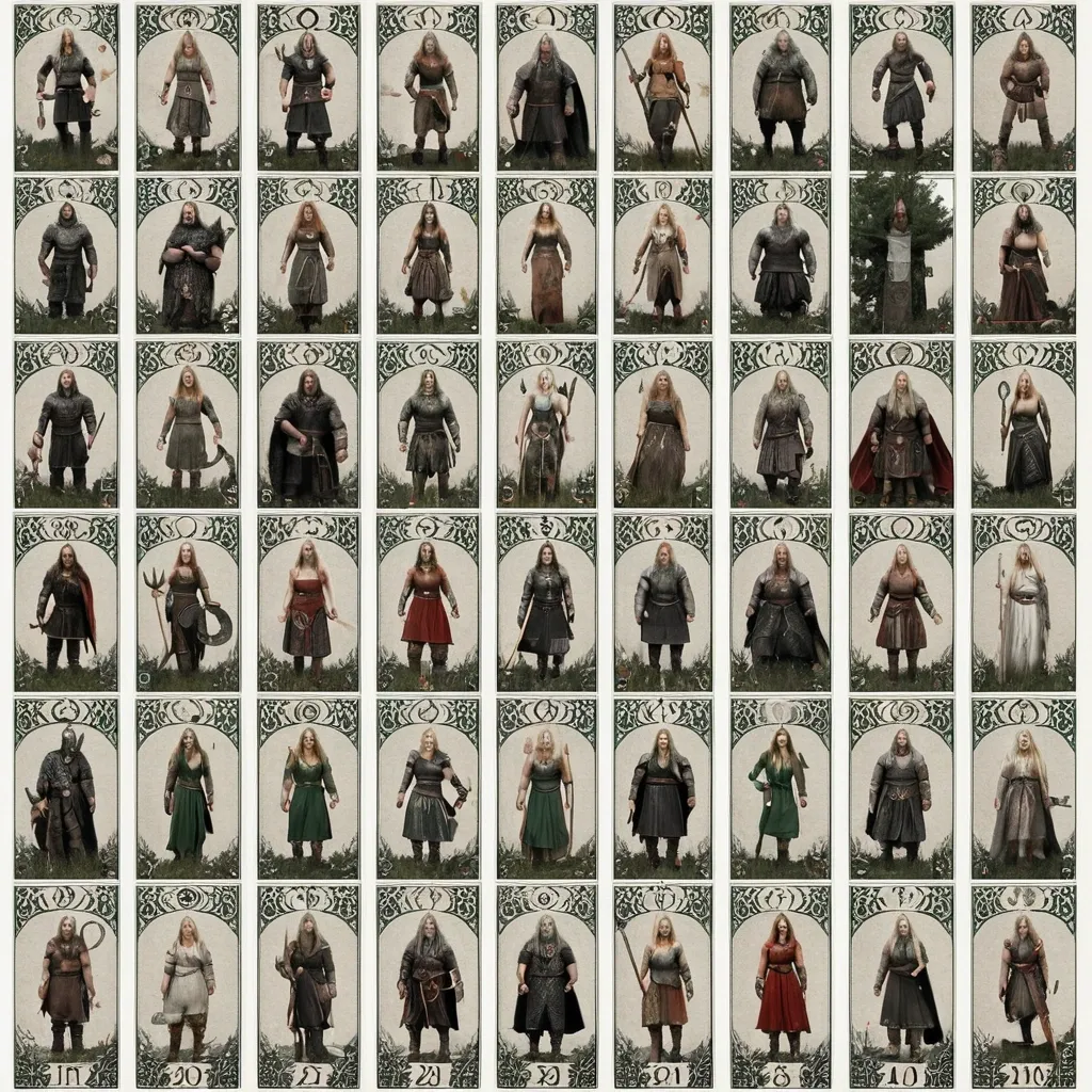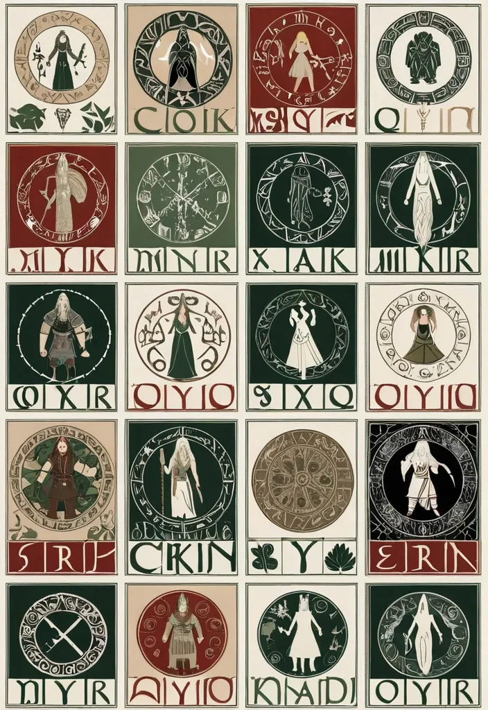 12 month calendar type collage of Nordic Gods and Goddesses (for example , Loki , Freya , Odin , and so on). Generate fantasy type pictures of 12 random Nordig Gods and Goddesses. Include the twelve figures for each month of the year and add their 12 names under the 12 pictures. Do not include symbols or objects for the figures' places on the calendar. Decorate the outer margin of the calendar with Germanic runes , old Scandinavian motifs (for example , tribal markings , vine motifs , leaves). Use black , white , grey , forest green , red , and beige colors. ,