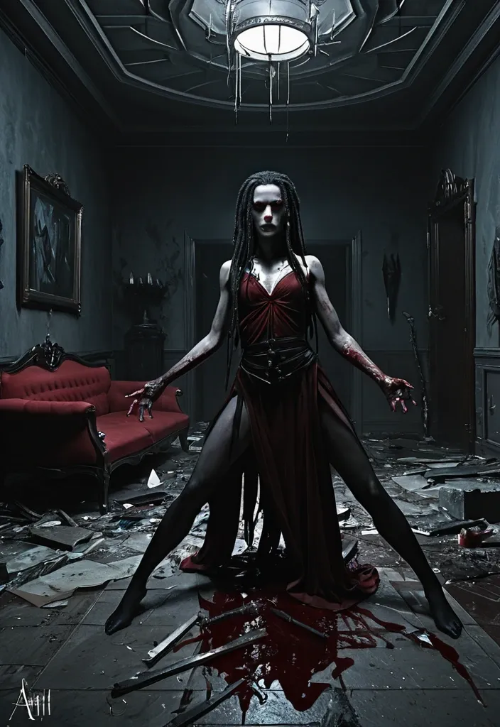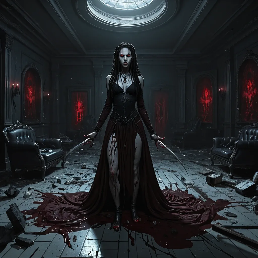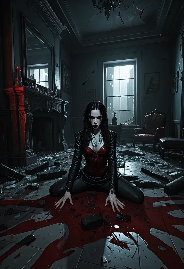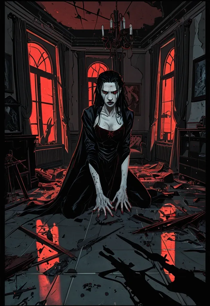 https://arthub.ai/post/df00db9e-3681-4ed9-b3c2-25e9456ebe88 https://arthub.ai/post/b5b5d950-293c-4a87-b291-ecdb1b13d24d https://arthub.ai/post/af99f3e4-973c-4f50-b305-bad080a1faaa "Esbelta , elegante e graciosa (Slender , elegant , and graceful) , she possesses a timeless beauty that belies her true age. She appears to be in her late 20s to early 30s , with dark skin , long dark dreadlocks , and striking eyes that hold a captivating allure. Her eyes have a subtle reddish hue , a telltale sign of her vampiric nature , adding to her mystique. She carries herself with a quiet confidence and an air of sophistication , reflecting her long life and vast experiences. Her movements are fluid and graceful , like a dancer , and her presence commands attention without demanding it." , A detailed graphic novel illustration , in the distinct style of Artstation comics with heavy ink outlines , strong chiaroscuro , and a gritty texture. The scene unfolds within a once-luxurious apartment , now in controlled disarray after a fierce vampire attack. Debris is scattered precisely: shattered glass from broken windows and picture frames , splintered pieces of a high-end wooden coffee table , a torn velvet armchair overturned , and decorative vases in shards on the floor. Crucially , the structural elements like the ceiling and main walls are intact , showing only superficial damage , maintaining the illusion of a normal home to outsiders. At the center , Liaandra , a slender and elegant female vampire with dark skin , long , intricate dreadlocks , and striking carmine red eyes , lies defeated on the floor , her expression a mix of exhaustion and defiance. She is subjugated by a dominant male vampire , whose pale skin , long , flowing black hair , and piercing red eyes convey cold superiority. He is stepping on her in a gesture of absolute humiliation and triumph. Surrounding them , two or three additional male vampires (each with pale skin , dark hair , and red eyes , dressed in sharp , dark clothing) are positioned dynamically. One might be lunging forward , another observing with a smirk , creating a sense of menacing encirclement. Their movements should suggest precision and predatory grace. The lighting is intensely dramatic , with strong , focused light sources casting long , exaggerated shadows that enhance the tension and danger. The ambient light is low , creating stark contrasts. The color palette is dominated by deep , rich reds (evoking blood and danger) , dark grays , and blacks , with occasional muted browns and blues for the environment , all contributing to a violent , chaotic , and somber mood. The composition should draw the eye directly to Liaandra and her subjugator , with the surrounding vampires framing the central action , highlighting her unique features and the stark contrast between her and her captors. ,