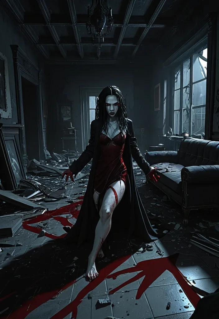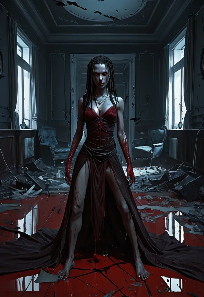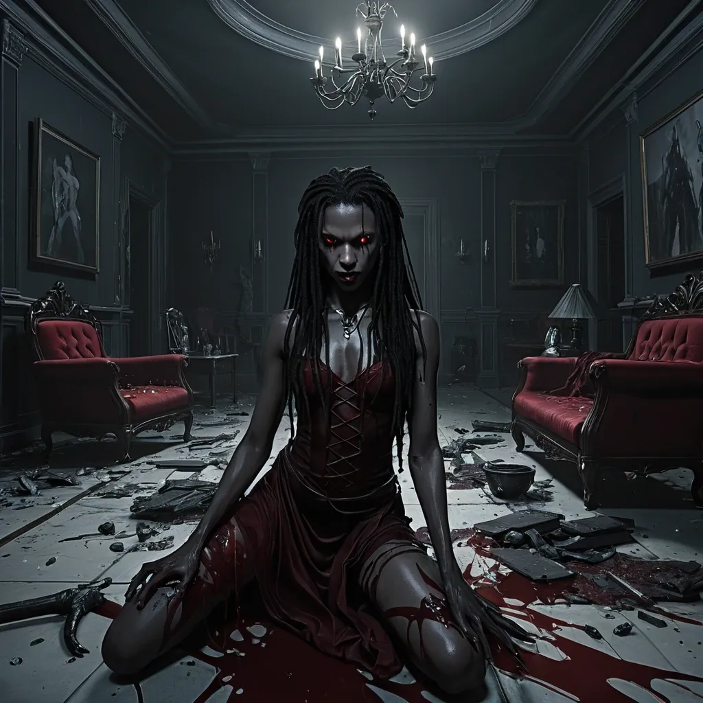 A detailed graphic novel illustration , in the distinct style of Artstation comics with heavy ink outlines , strong chiaroscuro , and a gritty texture. The scene unfolds within a once-luxurious apartment , now in controlled disarray after a fierce vampire attack. Debris is scattered precisely: shattered glass from broken windows and picture frames , splintered pieces of a high-end wooden coffee table , a torn velvet armchair overturned , and decorative vases in shards on the floor. Crucially , the structural elements like the ceiling and main walls are intact , showing only superficial damage , maintaining the illusion of a normal home to outsiders. At the center , Liaandra , a slender and elegant female vampire with dark skin , long , intricate dreadlocks , and striking carmine red eyes , lies defeated on the floor , her expression a mix of exhaustion and defiance. She is subjugated by a dominant male vampire , whose pale skin , long , flowing black hair , and piercing red eyes convey cold superiority. He is stepping on her in a gesture of absolute humiliation and triumph. Surrounding them , two or three additional male vampires (each with pale skin , dark hair , and red eyes , dressed in sharp , dark clothing) are positioned dynamically. One might be lunging forward , another observing with a smirk , creating a sense of menacing encirclement. Their movements should suggest precision and predatory grace. The lighting is intensely dramatic , with strong , focused light sources casting long , exaggerated shadows that enhance the tension and danger. The ambient light is low , creating stark contrasts. The color palette is dominated by deep , rich reds (evoking blood and danger) , dark grays , and blacks , with occasional muted browns and blues for the environment , all contributing to a violent , chaotic , and somber mood. The composition should draw the eye directly to Liaandra and her subjugator , with the surrounding vampires framing the central action , highlighting her unique features and the stark contrast between her and her captors. ,