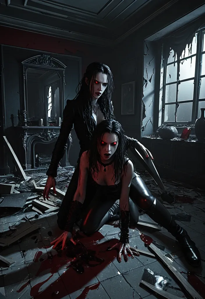A detailed graphic novel illustration , in the distinct style of Artstation comics with heavy ink outlines , strong chiaroscuro , and a gritty texture. The scene unfolds within a once-luxurious apartment , now in controlled disarray after a fierce vampire attack. Debris is scattered precisely: shattered glass from broken windows and picture frames , splintered pieces of a high-end wooden coffee table , a torn velvet armchair overturned , and decorative vases in shards on the floor. Crucially , the structural elements like the ceiling and main walls are intact , showing only superficial damage , maintaining the illusion of a normal home to outsiders. At the center , Liaandra , a slender and elegant female vampire with dark skin , long , intricate dreadlocks , and striking carmine red eyes , lies defeated on the floor , her expression a mix of exhaustion and defiance. She is subjugated by a dominant male vampire , whose pale skin , long , flowing black hair , and piercing red eyes convey cold superiority. He is stepping on her in a gesture of absolute humiliation and triumph. Surrounding them , two or three additional male vampires (each with pale skin , dark hair , and red eyes , dressed in sharp , dark clothing) are positioned dynamically. One might be lunging forward , another observing with a smirk , creating a sense of menacing encirclement. Their movements should suggest precision and predatory grace. The lighting is intensely dramatic , with strong , focused light sources casting long , exaggerated shadows that enhance the tension and danger. The ambient light is low , creating stark contrasts. The color palette is dominated by deep , rich reds (evoking blood and danger) , dark grays , and blacks , with occasional muted browns and blues for the environment , all contributing to a violent , chaotic , and somber mood. The composition should draw the eye directly to Liaandra and her subjugator , with the surrounding vampires framing the central action. ,