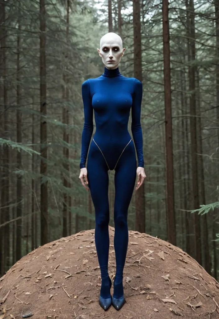 Una chica muy baja de metro veinte pero extraterrestre no humana su fisionomía es. piernas delgadas muy delgadas y cortas sin rodilla una cintura que continua su pierna y desde su cadera hasta los hombros formando un triángulo. Casi sin cuello , brazos y manos muy pequeñas y la cabeza en forma triangular boca muy pequeña sin nariz , sólo 2 agujeros pequeños , dos ojos grandes y negros sin blanco. Una especie de cadena fina encima natural que en medio de la frente sale un poco hacia arriba formando una pequeña espiral. los ojos , sin cejas ni pestañas. Viste un conjunto apretado de un color azulado marino. Está encima de un montículo de tierra , el bosque detrás. Es muy atractiva a su manera ,