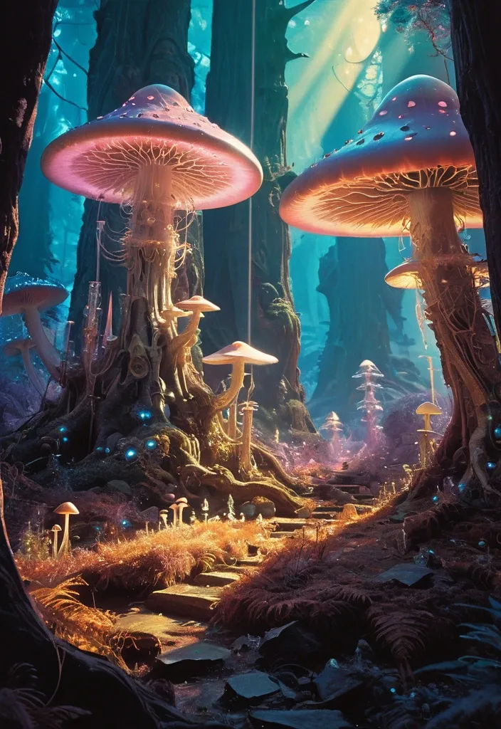 A mystical scene featuring a giant , translucent pumpkin in an enchanting forest. The pumpkin is hollow , revealing a vibrant tree with glowing purple leaves inside. Soft light emits from within the pumpkin , casting a warm , magical glow on the surrounding area. Tiny fairies with delicate wings flutter around the pumpkin , leaving shimmering trails in the air. The forest is twinkling with softly glowing lanterns hanging from the branches of elegantly intertwined trees. Various carved pumpkins with cheerful and spooky expressions dot the ground , creating a whimsical autumn atmosphere. The scenery is shrouded in a gentle mist , enhancing the dreamlike quality of the setting. The color palette consists of rich purples , warm oranges , and soft whites , which create a harmonious blend of warmth and magic. The composition emphasizes depth , allowing the viewer to feel drawn into the enchanted space. Use high-resolution imagery to capture the intricate details of the lanterns , fairies , and the textured surface of the pumpkin , making the scene immersive and captivating. ,