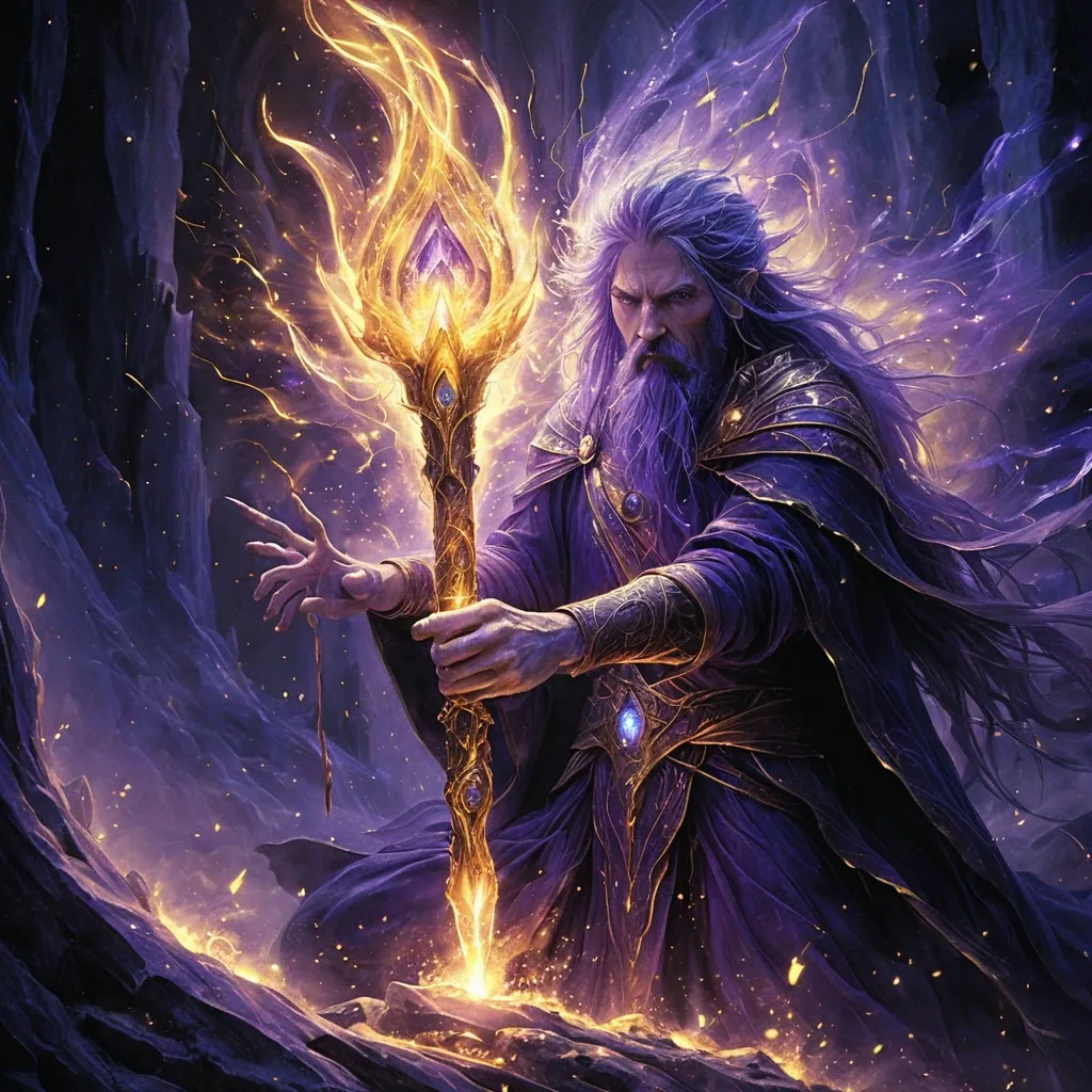 Masterpiece: Epic fantasy illustration , cinematic lighting: A crystalline wand bursting with primordial fire , sparks transforming into glowing runes. Gold-violet energy vortex in background. Style: Brian Froud meets mystical realism. Colors: deep violet , molten gold , electric blue. --ar 16:9 --v 6 ,