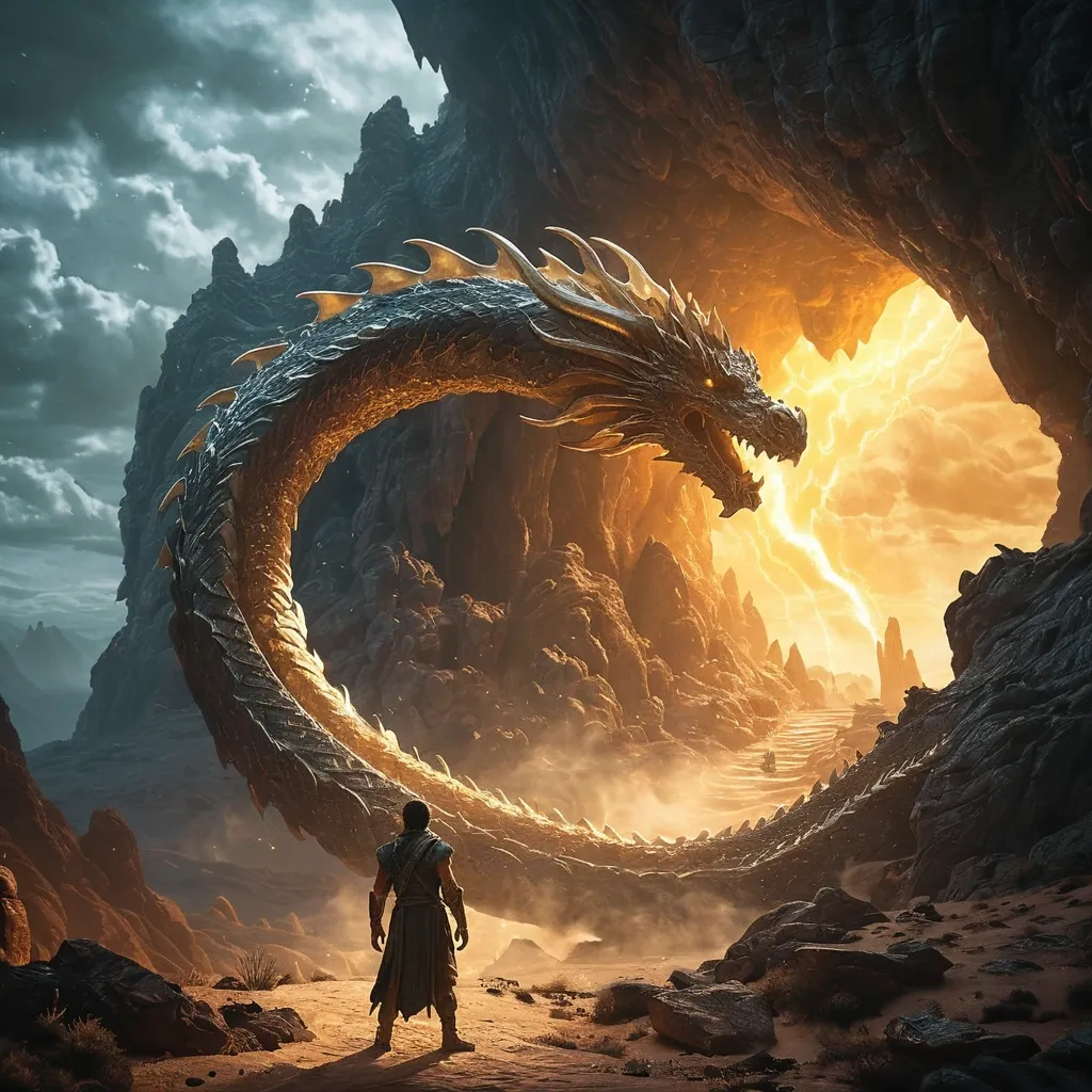 The image is a fantasy-themed artwork featuring a person standing in front of a massive dragon emerging from a cave. On the bottom right-hand side of a desert landscape , a person clad in bronze is standing , looking up toward a cave emitting clouds of white smoke that billow out of it. To the right of the cave is a rocky cliff. A massive , mythical dragon's tail , coiled like a serpent or snake , emerges from within the cave. The tail rises to the center of the top of the image , where the dragon is twisted in the air in a line facing leftward. Its body is in the center of the image , and it is glowing gold in the light of a luminous sky behind it. The right side of the creature's body borders the edge of the image. The background of the image includes a black sky of clouds surrounding the cave and dragons , with a portion of a glowing , luminous sky peeking through from the center of the image. ,