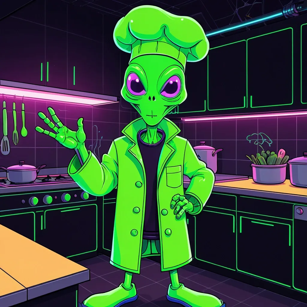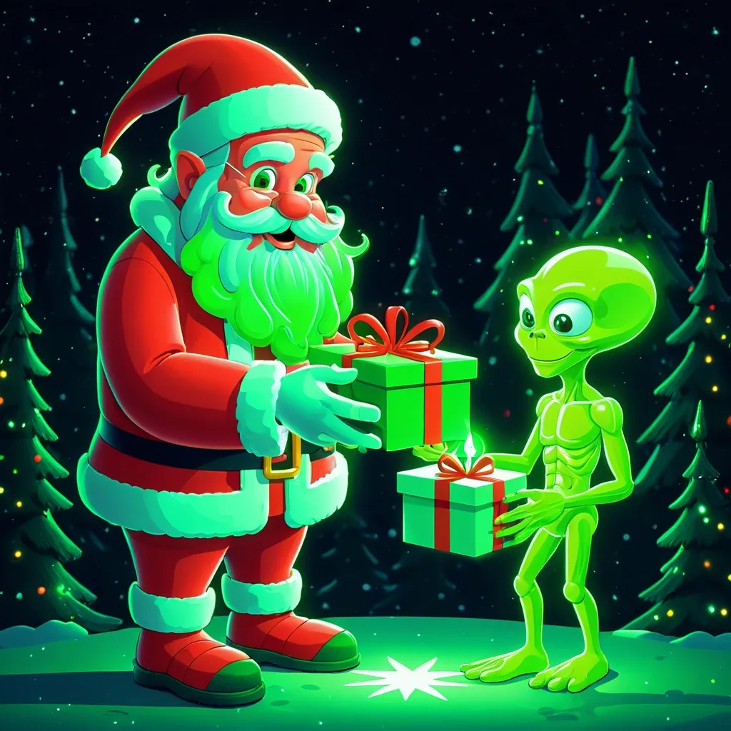 A surreal landscape where the UFO is contained within a colossal UFO vortex of Neon Green and Orange , its iris reflecting snow-capped peaks and wildflower meadows. Matrix code flows from the UFO. A lone alien figure stands on the shore of a crystal-clear lake at dark night , gazing into the depths of the UFO. The lake is a swirling vortex of fishes. Ethereal , fantastical , intricate patterns with nature and surreal compositions. Fantasy illustration for storybooks with surreal landscapes , and magical themes. ,
