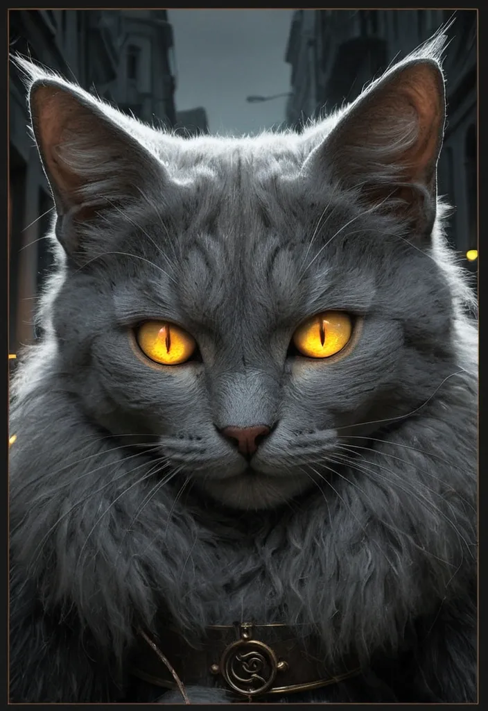 quiero que crees un gato con las siguientes caracteristicas y en ese momento: Tenía ojos ámbar , pelaje gris y un silencio antiguo en la mirada , pero ningún nombre que lo sostuviera. Una noche , mientras la ciudad dormía y los humanos soñaban con cosas que nunca harían , decidió marcharse. Sentía que había sido arrojado al mundo sin instrucciones , como si su existencia fuera un libro sin título. Así comenzó su viaje. ,