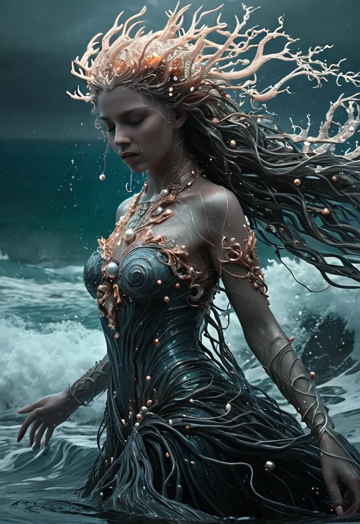 A mdjrny-v4 style portrait photograph of serene sea goddess , embodying the untamed power of the ocean , rising from a tempestuous sea. Her form is adorned with intricate coral and pearls , and her hair flows like kelp. Swirling patterns of water and light surround her , creating a dreamlike , abstract quality. The style is a blend of dark fantasy concept art and hyperrealism , inspired by the mythological interpretations of John William Waterhouse and the ethereal beauty of Wlop. ,