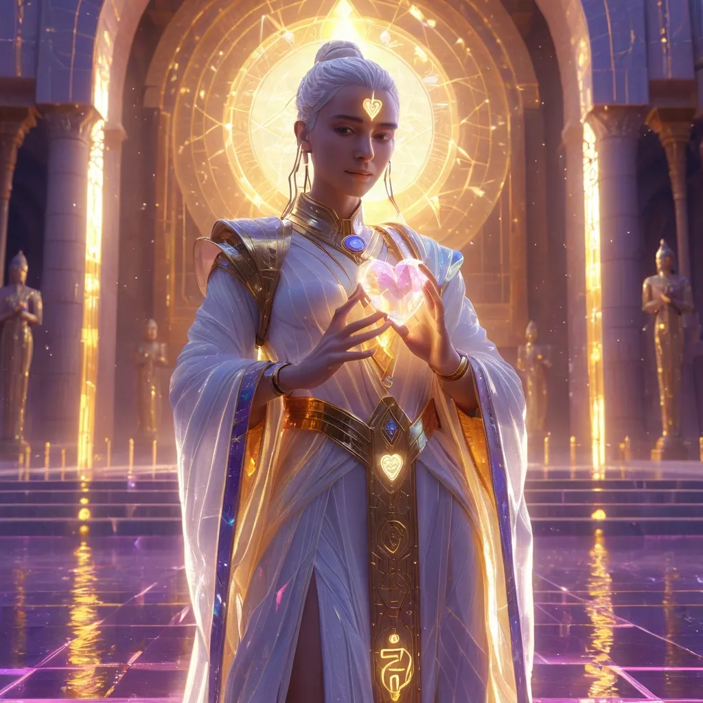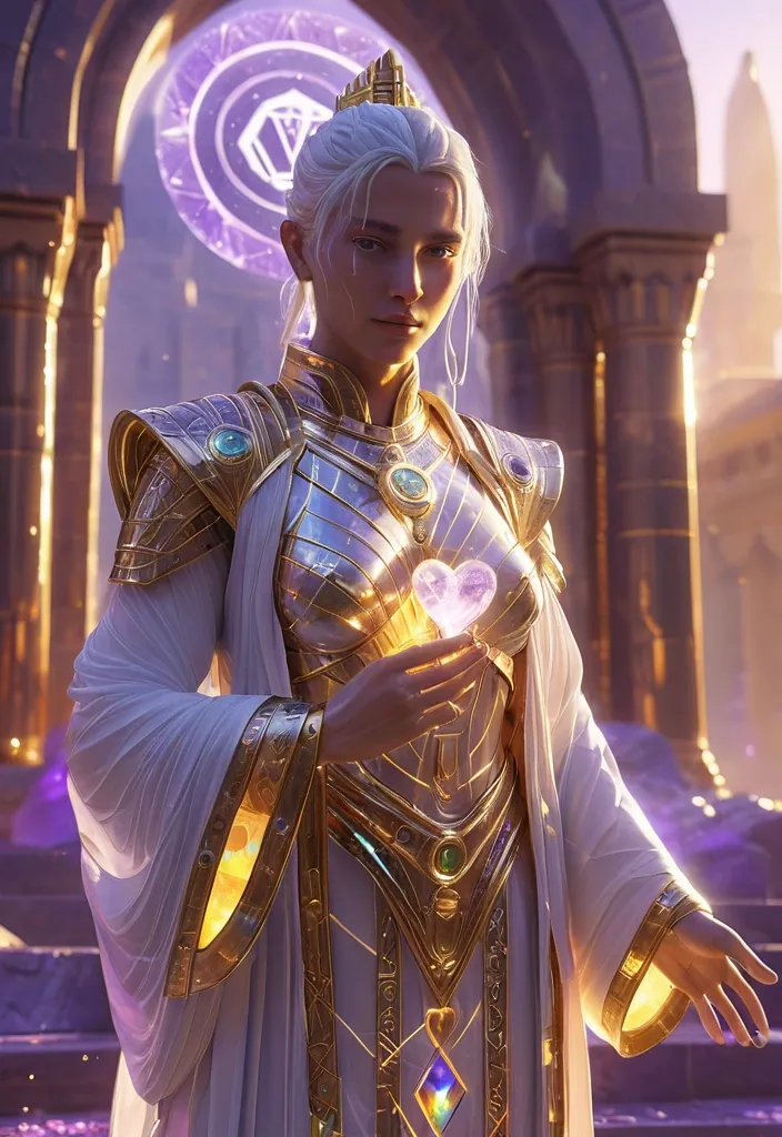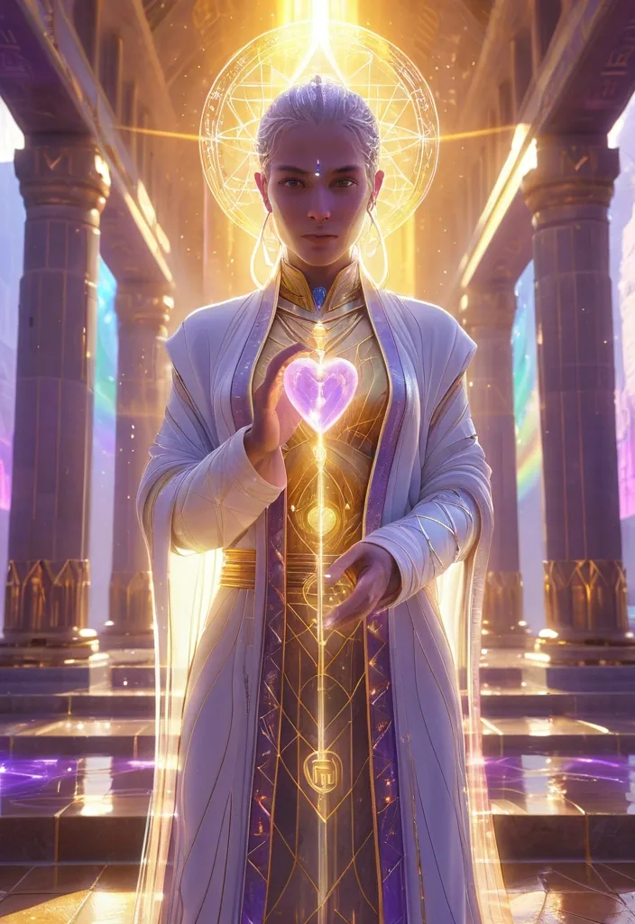 "Masterpiece: Eine lichtdurchflutete androgyne Gestalt mit Haaren aus fließendem klaren Kristall , in Roben aus goldenem und violettem Licht. Hält ein pulsierendes Kristallherz , von dem Sanskrit- , Ogham- und hebräische Schriftzeichen ausstrahlen. Im Hintergrund verschmelzen uralte und futuristische Architekturen im Regenbogen der Liebe. Detailreich , mystisch , hyperrealistisch , 8K , octane render" no Mutation , no ugly ,