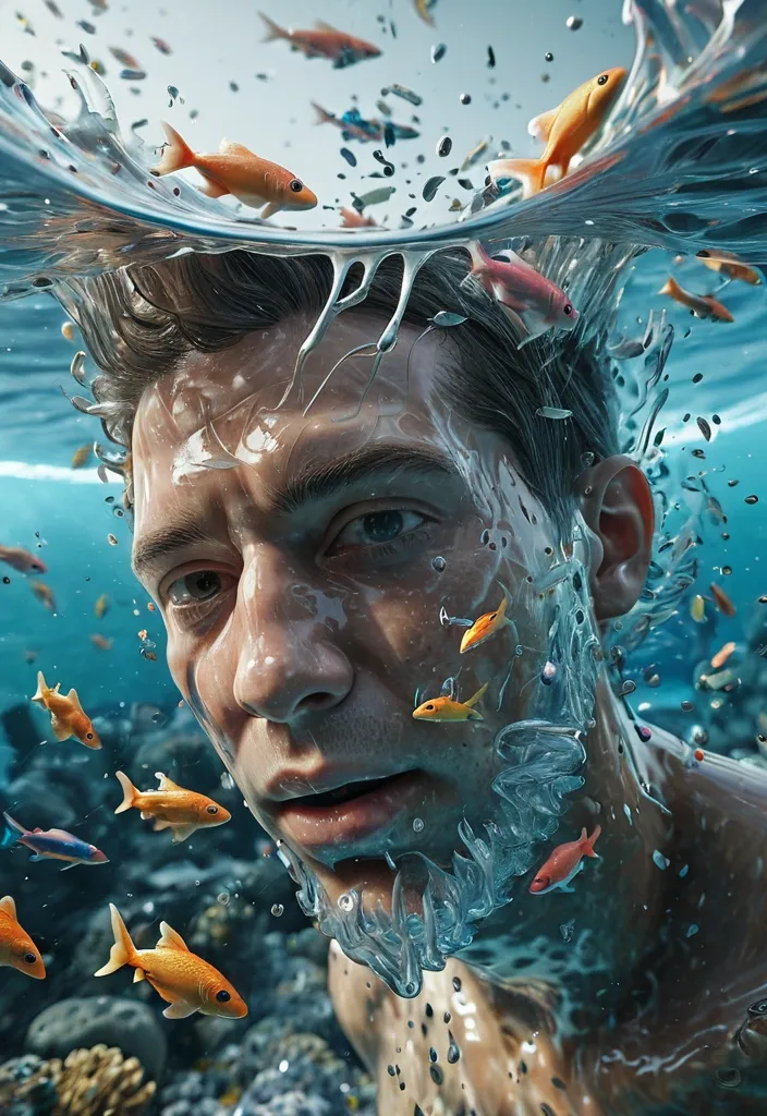 A human face , hyper-realistic 3D art rendering of the human (Use the uploaded image as the sole and 100% exact only face) , featuring a transparent glass-textured human face that encases a turbulent seascape within. This internal scene depicts crashing waves , divers with fish Spilling Out from the water's surface , soaring seagulls , and a vibrant underwater world teeming with colorful coral reefs , all rendered with exquisite textural detail and surrounded by splashing water droplets. The entire piece is rendered to an ultra-realistic 8K standard using the Octane renderer , utilizing ray-tracing technology to achieve authentic reflections , complemented by photo-realistic lighting and soft , natural shadows. Presented from a side angle against a minimalist , blurry living room background , ,