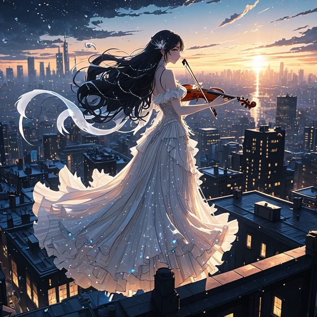 A young woman plays the violin on a rooftop terrace high above a cityscape at dusk. She has long , flowing dark hair that billows in the wind , and she wears an ethereal , translucent white dress with soft ruffles that shimmer in the evening light. The scene is illuminated by a warm , golden sunset casting a soft glow over everything , enhancing the dreamlike quality of the moment. In the background , a sprawling city is visible , dotted with lights as they begin to twinkle like stars against the twilight sky. White feathers float around her , adding a whimsical touch. The composition features a dynamic angle from above , emphasizing both the performer and the expansive city below. The artistic style is reminiscent of anime and digital painting , characterized by its vivid colors and intricate detail. The technique employs a blend of realism and fantasy , with high contrast between the bright foreground and the darker , atmospheric background. The influence of contemporary fantasy art and anime aesthetics shines through , drawing the viewer into a serene yet awe-inspiring atmosphere. ,