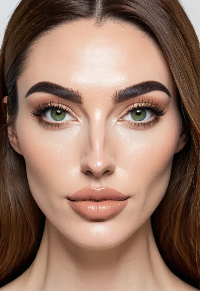 Head Shape: Oval with softly rounded cheeks tapering gently to a narrow , rounded chin. Balanced proportions between upper and lower face. • Hairline: Even curve across the forehead , no widow’s peak. Hair parted slightly to one side , smooth texture with subtle layering near the jawline. • Eyebrows: Medium thickness , smooth arch above the brow ridge , tapering slightly at the outer ends. Space between brows equals roughly one eye width. • Eyes: Almond-shaped , slightly angled upward at the outer corners. Iris visible completely (no drooping lids). Suggest green or light hazel tone. Eyelashes moderately long. • Nose: Straight bridge , medium width; gentle curve from bridge to softly rounded tip. Nostrils are small and symmetrical , base of the nose sits halfway between eyes and chin. • Lips: Full , even shape with a clearly defined Cupid’s bow; top lip slightly thinner than the bottom. Corners of mouth sit aligned with the inner edge of the irises. • Ears: Partially visible through hair , top of the ear aligned with eyebrow height , lower edge with nose base. • Jawline & Chin: Smoothly curved jawline with no sharp angles; chin softly rounded and proportionate. • Neck: Medium length and proportionate width; visible collarbones. • Skin Tone: Medium-light brown with warm undertones (suggest a blend of golden and rose hues for realism). ,