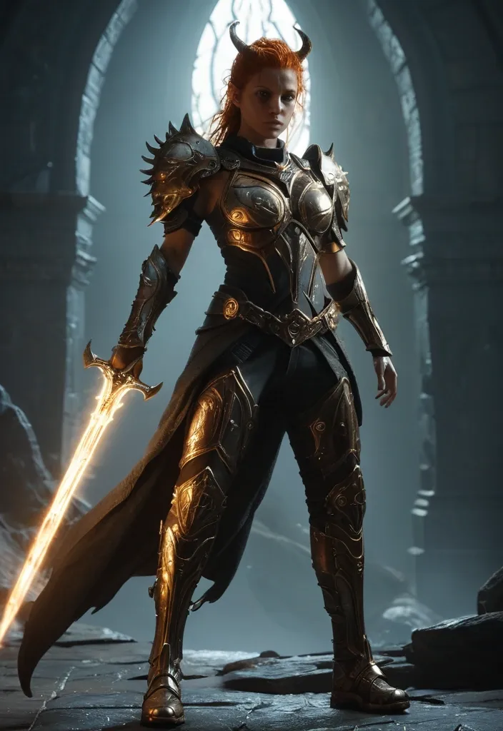 Seraphina , a celestial warrior of ambiguous origin , stands as a fusion of divine light and infernal steel. Her sun-touched skin bears faint glowing sigils along her sides like ancient runes , symbols of power rather than ornament. She wears rugged combat trousers and tactical gloves , a battle-ready figure shaped by discipline and survival. From her back , wings manifest in shifting forms—sometimes radiant arcs of light , sometimes metallic blades—suggesting a being caught between realms. Her eyes are heterochromatic , one amber and one silver , both calm and unwavering , reflecting loyalty and quiet strength. Subtle scars across her torso speak of past conflicts and endurance. Curved obsidian horns and a faint ember glow hint at a demonic lineage , balanced by an aura of celestial resolve. A long tail moves with controlled precision as she stands poised in a vast , cinematic environment. epic fantasy character design , cinematic lighting , dramatic atmosphere , high detail , realistic textures , dark fantasy , concept art , 8k , volumetric light , wide shot ,