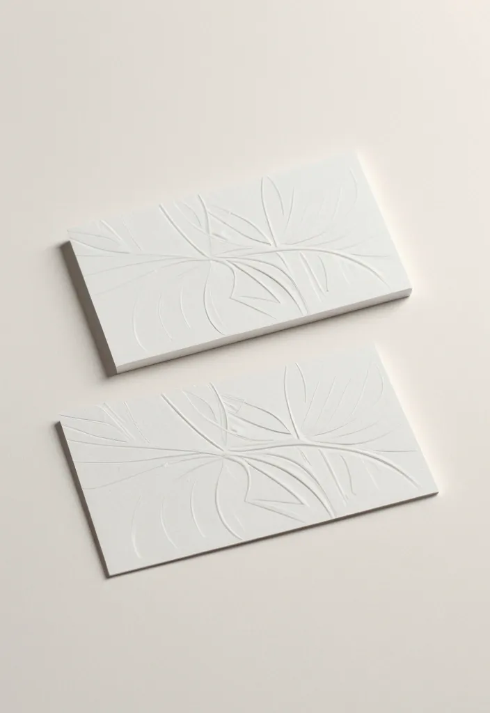 Minimalistic mockup of two white business cards lying on a light textured surface. Both cards are fully visible in the frame. One card slightly overlaps the other. Soft realistic shadows clearly show that there are two separate cards. Subtle paper texture is visible on both cards. One card has a very light embossed abstract pattern (leaf-like curves) barely noticeable , the other is blank. Neutral soft lighting , high-resolution , clean aesthetic , modern design mockup ,
