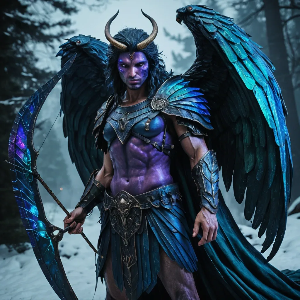 In photorealistic style and portrait format , create a fantasy image of a fierce looking half humanoid , half beast creature. The creature has the overall look of a mighty archangel , looking very powerful and dangerous. The creature has the head of a lion , the body of an ancient greek woman's statue (wearing ancient draped robes in colors of deep dark blue , purple , and fuchsia). The creature has wings that look like they are glowing from the inside , the feathers of the wing are made from stained glass (the colors are iridescent and glowing). The creature's eyes are a glowing neon blue. In its right hand , the creature is holding a giant composite bow that is made from a dark blue metal and it is emanating blue and green flames. Across the creature's chest and back , there is a huge quiver full of arrows with black arrow feathers. The quiver is made from dark patina green embossed leather. The creature is standing in front of a snowy forest background at night - you can see the moon and the stars in the sky. ,