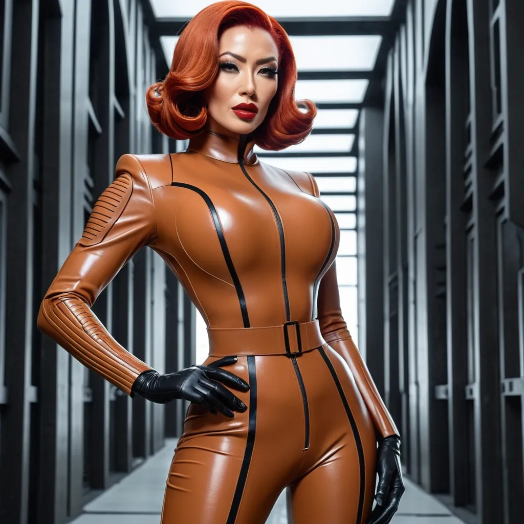 Generate Gorgeous female boss , bimbo , hourglass body , Japanese woman , abnormally massive female bodybuilder , gorgeous , close up , full lips , big booty , red hair , bob-cut hair style , feminine silhouette , too big breast , big booty , sexy thighs abs , silhouette , up close , flexing biceps , beautiful green eyes , legs are iconic and defining physical feature , both visually and in terms of combat ability.wearing an outfit that is a striking blend of elegance , power , and femininity , designed to command attention in any room. The suit is tailored to perfection , hugging the wearer’s curves with precision while emphasizing a structured silhouette. The fabric itself is a refined grey tweed patterned with subtle white grid lines , giving the suit a texture that feels both sophisticated and modern. The blazer features broad blue lapels and gold button accents , adding a luxurious touch that elevates the look beyond typical business attire. The matching high-waisted trousers elongate the frame , further enhancing the poised and commanding effect of the ensemble.The styling choices amplify the boldness of the suit. The inner blouse is a silky , greybutton-down shirt that complements the tweed’s tone while introducing a softer , feminine balance to the sharp tailoring of the jacket. The blouse peeks out neatly from under the blazer , maintaining elegance without drawing focus away from the suit’s commanding cut. Accessories are kept minimal yet intentional: a delicate layered gold necklace and hoop earrings that add glimmers of light and luxury without overpowering the outfit. The choice of voluminous , honey-brown braids cascading down her shoulders frames the face with both confidence and glamour , completing the commanding visual.Altogether , this look communicates a blend of authority and allure. It is business-ready yet fashion-forward , balancing corporate structure with vibrant femininity. The color palette blue , grey and gold avoids being overly delicate , instead embracing the richness of texture , structure , and presence. This is the kind of ensemble that speaks to ambition , sophistication , and personal style—ideal for someone who thrives in positions of influence but insists on expressing her individuality with bold elegance. It’s not just clothing—it’s a statement of power wrapped in grace. In luxury living legs that could crush a watermelon , skirt high boots are a bold and striking statement piece , crafted in glossy black patent leather that gives them a sleek , polished finish. Rising to just below the knee , the boots feature three adjustable buckle straps along the shaft , adding both edge and detail to their design. The towering stiletto heel , paired with a thick platform sole , creates an ultra-dramatic silhouette that elongates the leg and exudes power and confidence. With their combination of shine , height , and structure , these boots perfectly balance fierce femininity with high-fashion allure. Massive breast , massive cleavage , Up close shotShe’s wearing a fitted , futuristic 1940s-inspired tan utility suit with a structured vest , reinforced seams , integrated tech bracers , and elegant vertical lines forming a subtle ogee pattern that emphasizes strength , symmetry , and refined power. ,