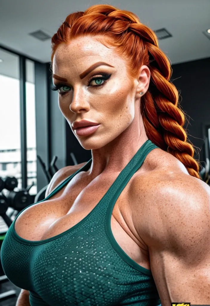 Generate Gorgeous female boss , bimbo , hourglass body , abnormally massive female bodybuilder , gorgeous , close up , full lips , big booty , redhead , freckles on face and breast , braided design hair , feminine silhouette , too big breast , big booty , sexy thighs abs , silhouette , up close , flexing biceps , beautiful green eyes , legs are iconic and defining physical feature , both visually and in terms of combat ability.wearing an outfit that is a striking blend of elegance , power , and femininity , designed to command attention in any room. The suit is tailored to perfection , hugging the wearer’s curves with precision while emphasizing a structured silhouette. The fabric itself is a refined grey tweed patterned with subtle white grid lines , giving the suit a texture that feels both sophisticated and modern. The blazer features broad blue lapels and gold button accents , adding a luxurious touch that elevates the look beyond typical business attire. The matching high-waisted trousers elongate the frame , further enhancing the poised and commanding effect of the ensemble.The styling choices amplify the boldness of the suit. The inner blouse is a silky , greybutton-down shirt that complements the tweed’s tone while introducing a softer , feminine balance to the sharp tailoring of the jacket. The blouse peeks out neatly from under the blazer , maintaining elegance without drawing focus away from the suit’s commanding cut. Accessories are kept minimal yet intentional: a delicate layered gold necklace and hoop earrings that add glimmers of light and luxury without overpowering the outfit. The choice of voluminous , honey-brown braids cascading down her shoulders frames the face with both confidence and glamour , completing the commanding visual.Altogether , this look communicates a blend of authority and allure. It is business-ready yet fashion-forward , balancing corporate structure with vibrant femininity. The color palette blue , grey and gold avoids being overly delicate , instead embracing the richness of texture , structure , and presence. This is the kind of ensemble that speaks to ambition , sophistication , and personal style—ideal for someone who thrives in positions of influence but insists on expressing her individuality with bold elegance. It’s not just clothing—it’s a statement of power wrapped in grace. In luxury living legs that could crush a watermelon , skirt high boots are a bold and striking statement piece , crafted in glossy black patent leather that gives them a sleek , polished finish. Rising to just below the knee , the boots feature three adjustable buckle straps along the shaft , adding both edge and detail to their design. The towering stiletto heel , paired with a thick platform sole , creates an ultra-dramatic silhouette that elongates the leg and exudes power and confidence. With their combination of shine , height , and structure , these boots perfectly balance fierce femininity with high-fashion allure. High cheekbones , prominent jawline , gorgeous big green eyes , freckles , enormous breast , blue tank top , high rise grey short , enormous breast , enormous butt ,