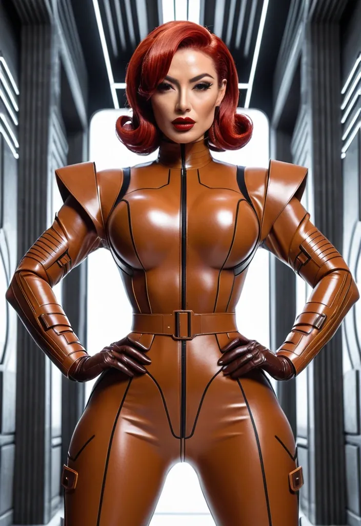 Generate Gorgeous female boss , bimbo , hourglass body , Japanese woman , abnormally massive female bodybuilder , gorgeous , close up , full lips , big booty , red hair , bob-cut hair style , feminine silhouette , too big breast , big booty , sexy thighs abs , silhouette , up close , flexing biceps , beautiful green eyes , legs are iconic and defining physical feature , both visually and in terms of combat ability.wearing an outfit that is a striking blend of elegance , power , and femininity , designed to command attention in any room. The suit is tailored to perfection , hugging the wearer’s curves with precision while emphasizing a structured silhouette. The fabric itself is a refined grey tweed patterned with subtle white grid lines , giving the suit a texture that feels both sophisticated and modern. The blazer features broad blue lapels and gold button accents , adding a luxurious touch that elevates the look beyond typical business attire. The matching high-waisted trousers elongate the frame , further enhancing the poised and commanding effect of the ensemble.The styling choices amplify the boldness of the suit. The inner blouse is a silky , greybutton-down shirt that complements the tweed’s tone while introducing a softer , feminine balance to the sharp tailoring of the jacket. The blouse peeks out neatly from under the blazer , maintaining elegance without drawing focus away from the suit’s commanding cut. Accessories are kept minimal yet intentional: a delicate layered gold necklace and hoop earrings that add glimmers of light and luxury without overpowering the outfit. The choice of voluminous , honey-brown braids cascading down her shoulders frames the face with both confidence and glamour , completing the commanding visual.Altogether , this look communicates a blend of authority and allure. It is business-ready yet fashion-forward , balancing corporate structure with vibrant femininity. The color palette blue , grey and gold avoids being overly delicate , instead embracing the richness of texture , structure , and presence. This is the kind of ensemble that speaks to ambition , sophistication , and personal style—ideal for someone who thrives in positions of influence but insists on expressing her individuality with bold elegance. It’s not just clothing—it’s a statement of power wrapped in grace. In luxury living legs that could crush a watermelon , skirt high boots are a bold and striking statement piece , crafted in glossy black patent leather that gives them a sleek , polished finish. Rising to just below the knee , the boots feature three adjustable buckle straps along the shaft , adding both edge and detail to their design. The towering stiletto heel , paired with a thick platform sole , creates an ultra-dramatic silhouette that elongates the leg and exudes power and confidence. With their combination of shine , height , and structure , these boots perfectly balance fierce femininity with high-fashion allure. Massive breast , massive cleavage , Up close shotShe’s wearing a fitted , futuristic 1940s-inspired leater , tan utility suit with a structured vest , reinforced seams , integrated tech bracers , and elegant vertical lines forming a subtle ogee pattern that emphasizes strength , symmetry , and refined power. Gorgeous brown eyes , enormous butt ,
