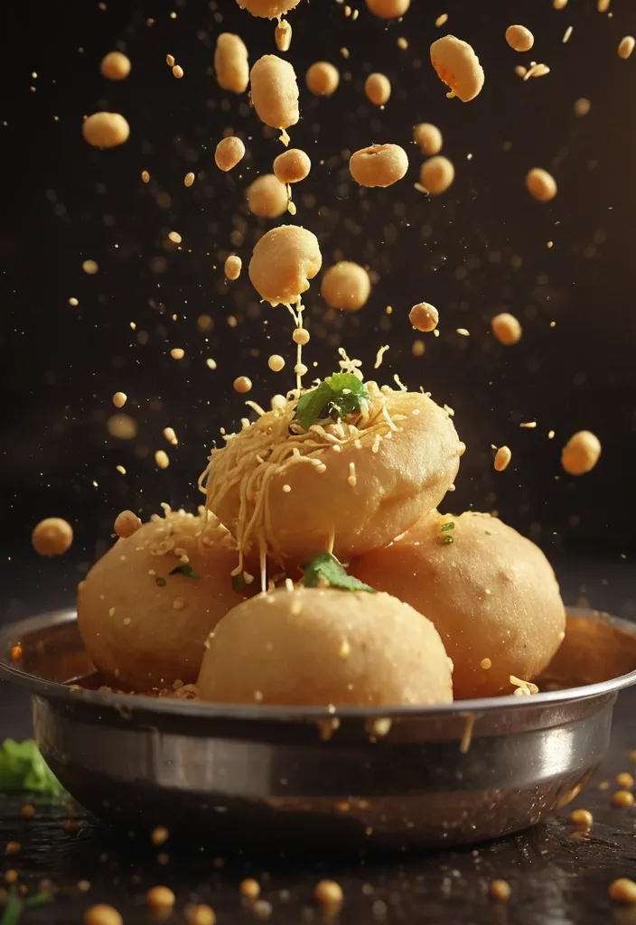 cinematic slow-motion food video of pani puri (golgappa) exploding in mid-air. Three crispy puris float vertically , one above the other , as spicy tamarind water splashes dynamically in all directions. Chickpeas , potato filling , sev , mint leaves , and droplets of pani burst outward in ultra-detailed slow motion. The top puri gently spins , the middle puri opens slightly revealing the filling , and the bottom puri dips toward a steel bowl below. Golden liquid droplets shimmer under warm studio lighting. Background softly blurred , shallow depth of field , hyper-realistic textures , crisp crunch details visible. Camera performs a subtle push-in with micro shake for realism. High-speed cinematic capture , dramatic food commercial style , vibrant Indian street food aesthetics , ultra-sharp , 4K quality , realistic physics , appetizing motion. ,