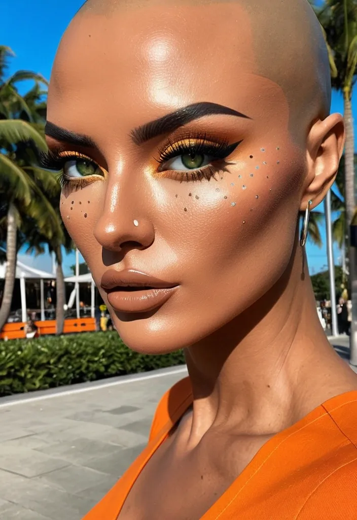 This Colombian woman possesses a strikingly beautiful and commanding face , exuding an ethereal , futuristic allure with her completely shaved head that accentuates her smooth , flawless caramel-toned skin dotted with subtle freckles across her cheeks and nose. Her eyebrows are bold , dark , and perfectly arched , framing her most captivating feature: large , mesmerizing hazel-green eyes with light-reflecting irises that gleam with intensity and depth , enhanced by long , dramatic false lashes and precise eyeliner for a piercing , almost otherworldly gaze. Her face shape is elegantly oval with high cheekbones and a strong , defined jawline that conveys both strength and femininity. Her full , plump lips , coated in glossy pink-lipstick , curve into a subtle , confident pout that radiates sensuality. Overall , her beauty is a flawless blend of bold ethnic features , cybernetic edge , and hyper-feminine glamour , making her appear like a powerful sci-fi goddess. The picture is taken from a close-up , slightly low-angle perspective , emphasize dominance and intensity of her face and powerful hourglass silhouette , with soft dramatic lighting highlighting her features against a blurred , neon-lit backgroundegs are iconic and defining physical feature , both visually and in terms of combat ability.wearing an outfit that is a striking blend of elegance , power , and femininity , designed to command attention in any room. The suit is tailored to perfection , hugging the wearer’s curves with precision while emphasizing a structured silhouette. The fabric itself is a refined grey tweed patterned with subtle white grid lines , giving the suit a texture that feels both sophisticated and modern. The blazer features broad blue lapels and gold button accents , adding a luxurious touch that elevates the look beyond typical business attire. The matching high-waisted trousers elongate the frame , further enhancing the poised and commanding effect of the ensemble.The styling choices amplify the boldness of the suit. The inner blouse is a silky , greybutton-down shirt that complements the tweed’s tone while introducing a softer , feminine balance to the sharp tailoring of the jacket. The blouse peeks out neatly from under the blazer , maintaining elegance without drawing focus away from the suit’s commanding cut. Accessories are kept minimal yet intentional: a delicate layered gold necklace and hoop earrings that add glimmers of light and luxury without overpowering the outfit. He eyes frames the face with both confidence and glamour , completing the commanding visual.Altogether , this look communicates a blend of authority and allure. It is business-ready yet fashion-forward , balancing corporate structure with vibrant femininity. The color palette blue , grey and gold avoids being overly delicate , instead embracing the richness of texture , structure , and presence. This is the kind of ensemble that speaks to ambition , sophistication , and personal style—ideal for someone who thrives in positions of influence but insists on expressing her individuality with bold elegance. It’s not just clothing—it’s a statement of power wrapped in grace. In luxury living legs that could crush a watermelon , skirt high boots are a bold and striking statement piece , crafted in glossy black patent leather that gives them a sleek , polished finish. Rising to just below the knee , the boots feature three adjustable buckle straps along the shaft , adding both edge and detail to their design. The towering stiletto heel , paired with a thick platform sole , creates an ultra-dramatic silhouette that elongates the leg and exudes power and confidence. With their combination of shine , height , and structure , these boots perfectly balance fierce femininity with high-fashion allure. High cheekbones , prominent jawline , gorgeous big light reflecting dark-greenish brown eyes , enormous breast , cartoon panther on orange and black t-shirt-shirt , denim shorts , denim walking in amusement park , full body shot ,