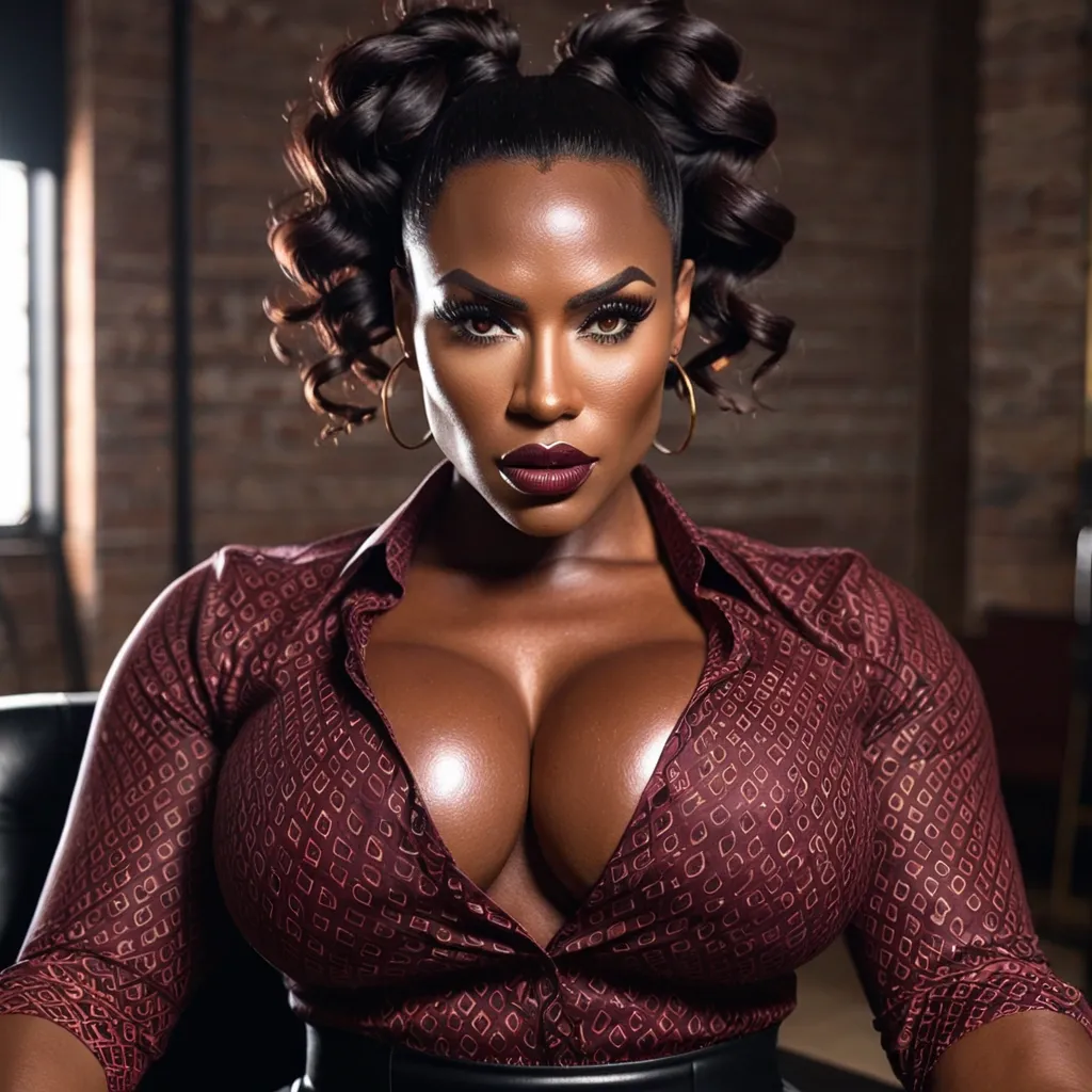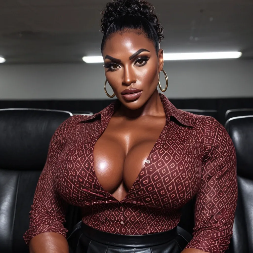 Generate Gorgeous female boss , bimbo , dark-skinned very African-American female , hourglass body , abnormally massive female bodybuilder , gorgeous , close up , full lips , big booty , brown , on face and breast , ponytail pixie hair , short pixie hair , curly , feminine silhouette , too big breast , big booty , sexy thighs abs , silhouette , up close , flexing biceps , beautiful green eyes , legs are iconic and defining physical feature , both visually and in terms of combat ability.wearing an outfit that is a striking blend of elegance , power , and femininity , designed to command attention in any room. The suit is tailored to perfection , hugging the wearer’s curves with precision while emphasizing a structured silhouette. The fabric itself is a refined grey tweed patterned with subtle white grid lines , giving the suit a texture that feels both sophisticated and modern. The blazer features broad blue lapels and gold button accents , adding a luxurious touch that elevates the look beyond typical business attire. The matching high-waisted trousers elongate the frame , further enhancing the poised and commanding effect of the ensemble.The styling choices amplify the boldness of the suit. The inner blouse is a silky , greybutton-down shirt that complements the tweed’s tone while introducing a softer , feminine balance to the sharp tailoring of the jacket. The blouse peeks out neatly from under the blazer , maintaining elegance without drawing focus away from the suit’s commanding cut. Accessories are kept minimal yet intentional: a delicate layered gold necklace and hoop earrings that add glimmers of light and luxury without overpowering the outfit. The choice of voluminous , honey-brown braids cascading down her shoulders frames the face with both confidence and glamour , completing the commanding visual.Altogether , this look communicates a blend of authority and allure. It is business-ready yet fashion-forward , balancing corporate structure with vibrant femininity. The color palette blue , grey and gold avoids being overly delicate , instead embracing the richness of texture , structure , and presence. This is the kind of ensemble that speaks to ambition , sophistication , and personal style—ideal for someone who thrives in positions of influence but insists on expressing her individuality with bold elegance. It’s not just clothing—it’s a statement of power wrapped in grace. In luxury living legs that could crush a watermelon , skirt high boots are a bold and striking statement piece , crafted in glossy black patent leather that gives them a sleek , polished finish. Rising to just below the knee , the boots feature three adjustable buckle straps along the shaft , adding both edge and detail to their design. The towering stiletto heel , paired with a thick platform sole , creates an ultra-dramatic silhouette that elongates the leg and exudes power and confidence. With their combination of shine , height , and structure , these boots perfectly balance fierce femininity with high-fashion allure. High cheekbones , prominent jawline , gorgeous big light reflecting hazel eyes , enormous breast , dark v-neck burgundy kilm patterned oxford shirt black skirt , , sitting in movie theater ,