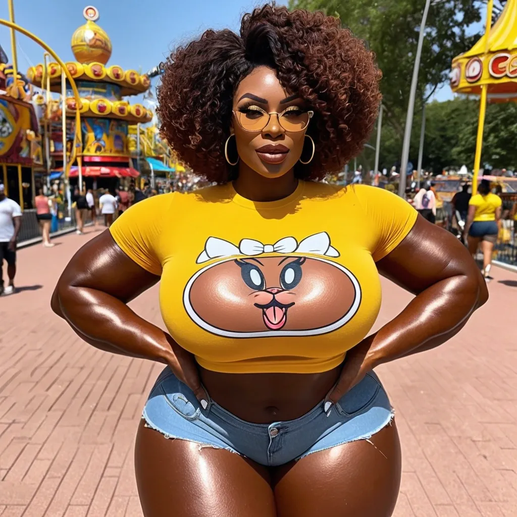 Generate Gorgeous female boss , bimbo , dark-skinned very African-American female , hourglass body , abnormally massive female bodybuilder , gorgeous , close up , full lips , big booty , brown , on face and breast , short pixie hair , curly , feminine silhouette , too big breast , big booty , sexy thighs abs , silhouette , up close , flexing biceps , beautiful green eyes , legs are iconic and defining physical feature , both visually and in terms of combat ability.wearing an outfit that is a striking blend of elegance , power , and femininity , designed to command attention in any room. The suit is tailored to perfection , hugging the wearer’s curves with precision while emphasizing a structured silhouette. The fabric itself is a refined grey tweed patterned with subtle white grid lines , giving the suit a texture that feels both sophisticated and modern. The blazer features broad blue lapels and gold button accents , adding a luxurious touch that elevates the look beyond typical business attire. The matching high-waisted trousers elongate the frame , further enhancing the poised and commanding effect of the ensemble.The styling choices amplify the boldness of the suit. The inner blouse is a silky , greybutton-down shirt that complements the tweed’s tone while introducing a softer , feminine balance to the sharp tailoring of the jacket. The blouse peeks out neatly from under the blazer , maintaining elegance without drawing focus away from the suit’s commanding cut. Accessories are kept minimal yet intentional: a delicate layered gold necklace and hoop earrings that add glimmers of light and luxury without overpowering the outfit. The choice of voluminous , honey-brown braids cascading down her shoulders frames the face with both confidence and glamour , completing the commanding visual.Altogether , this look communicates a blend of authority and allure. It is business-ready yet fashion-forward , balancing corporate structure with vibrant femininity. The color palette blue , grey and gold avoids being overly delicate , instead embracing the richness of texture , structure , and presence. This is the kind of ensemble that speaks to ambition , sophistication , and personal style—ideal for someone who thrives in positions of influence but insists on expressing her individuality with bold elegance. It’s not just clothing—it’s a statement of power wrapped in grace. In luxury living legs that could crush a watermelon , skirt high boots are a bold and striking statement piece , crafted in glossy black patent leather that gives them a sleek , polished finish. Rising to just below the knee , the boots feature three adjustable buckle straps along the shaft , adding both edge and detail to their design. The towering stiletto heel , paired with a thick platform sole , creates an ultra-dramatic silhouette that elongates the leg and exudes power and confidence. With their combination of shine , height , and structure , these boots perfectly balance fierce femininity with high-fashion allure. High cheekbones , prominent jawline , gorgeous big light reflecting hazel eyes , enormous breast , cartoon bunny on yellow t-shirt-shirt , denim shorts , walking in amusement park , ,