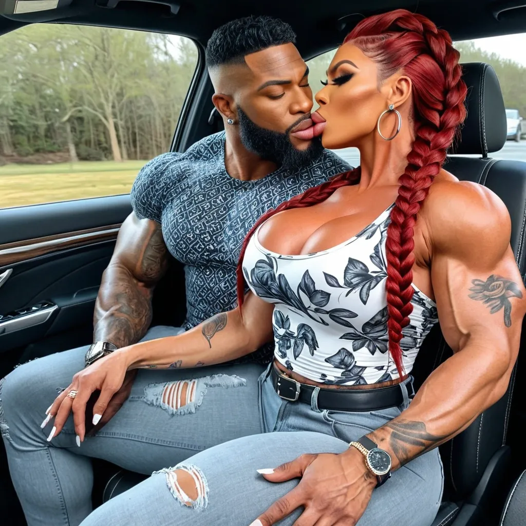 Generate Gorgeous female boss , bimbo , hourglass body , abnormally massive female bodybuilder , gorgeous , close up , full lips , big booty , redheaded , freckles on face and breast , braided design hair , feminine silhouette , too big breast , big booty , sexy thighs abs , silhouette , up close , flexing biceps , beautiful green eyes , legs are iconic and defining physical feature , both visually and in terms of combat ability.wearing an outfit that is a striking blend of elegance , power , and femininity , designed to command attention in any room. The suit is tailored to perfection , hugging the wearer’s curves with precision while emphasizing a structured silhouette. The fabric itself is a refined grey tweed patterned with subtle white grid lines , giving the suit a texture that feels both sophisticated and modern. The blazer features broad blue lapels and gold button accents , adding a luxurious touch that elevates the look beyond typical business attire. The matching high-waisted trousers elongate the frame , further enhancing the poised and commanding effect of the ensemble.The styling choices amplify the boldness of the suit. The inner blouse is a silky , greybutton-down shirt that complements the tweed’s tone while introducing a softer , feminine balance to the sharp tailoring of the jacket. The blouse peeks out neatly from under the blazer , maintaining elegance without drawing focus away from the suit’s commanding cut. Accessories are kept minimal yet intentional: a delicate layered gold necklace and hoop earrings that add glimmers of light and luxury without overpowering the outfit. The choice of voluminous , honey-brown braids cascading down her shoulders frames the face with both confidence and glamour , completing the commanding visual.Altogether , this look communicates a blend of authority and allure. It is business-ready yet fashion-forward , balancing corporate structure with vibrant femininity. The color palette blue , grey and gold avoids being overly delicate , instead embracing the richness of texture , structure , and presence. This is the kind of ensemble that speaks to ambition , sophistication , and personal style—ideal for someone who thrives in positions of influence but insists on expressing her individuality with bold elegance. It’s not just clothing—it’s a statement of power wrapped in grace. In luxury living legs that could crush a watermelon , skirt high boots are a bold and striking statement piece , crafted in glossy black patent leather that gives them a sleek , polished finish. Rising to just below the knee , the boots feature three adjustable buckle straps along the shaft , adding both edge and detail to their design. The towering stiletto heel , paired with a thick platform sole , creates an ultra-dramatic silhouette that elongates the leg and exudes power and confidence. With their combination of shine , height , and structure , these boots perfectly balance fierce femininity with high-fashion allure. Massive breast , massive cleavage , driving and sitting a car , wearing a black , blue amd gray floral t-shirt , gray denim pants , enormous butt sitting next to handsome muscular African-American man with horse , black hair or well trim beard , a white and black square pattern shirt with blue jeans , impressing one another long tongue , kissing romantic scene ,