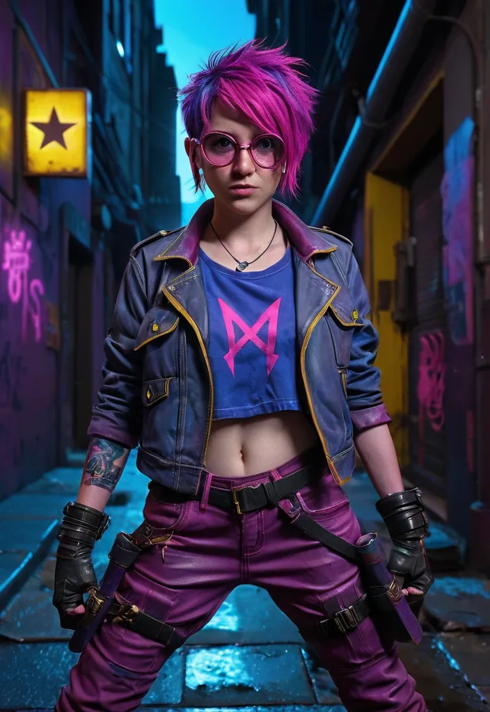 Highly detailed , realistic portrait of Ramona Flowers. She has vibrantly colored messy short hair , with bright pink on top and a rich purple undercut , and dark steampunk goggles with brass frames resting on her head. She is wearing a distressed dark grey leather biker jacket over a simple blue t-shirt , maroon-burgundy trousers , and chunky dark combat boots. She carries a blue canvas messenger bag with a yellow five-pointed star on it over her shoulder. The character is in a dynamic , defensive fighting stance with hands raised. Set in a dimly lit city alleyway at night , with purple and pink neon sign reflections and urban decay , in the style of a high-quality cinematic photograph , photojournalism feel , dramatic lighting ,
