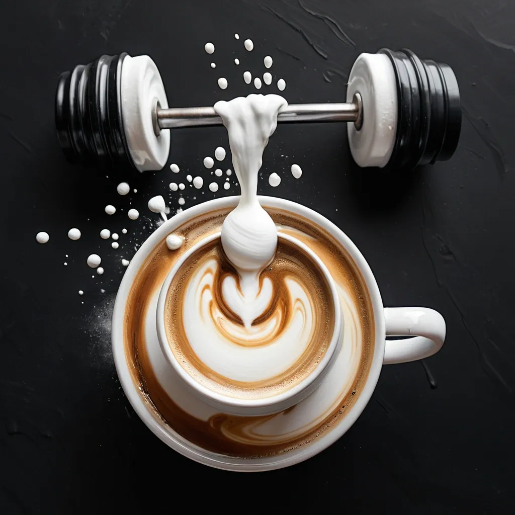Painterly oil-painting style illustration with visible brushstrokes and soft blended edges , clearly painted and not photo-realistic , near top-down view of a single ceramic coffee cup filled with a vertical snail like a bodybuilding champion lifting sports barbells in his hands of divine breath into form-shaped milk foam art centered on the surface , the cup filling the bottom two-thirds of the image , resting on a smooth dark black or deep brown commercial coffee-shop counter , minimal background detail. ,