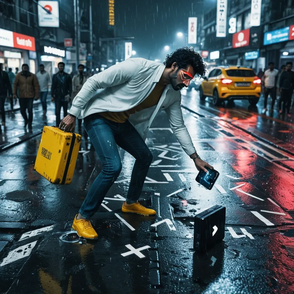 A photorealistic scene of a vadodara city street at night after rain , filmed from above , as if from a CCTV camera , at an angle of approximately 35-45°. The wet asphalt reflects the neon lights of the city and the headlights of cars. A zebra crossing is surrounded by a stream of people , blurred by motion. In the center of the frame is a man with the face and appearance from the reference photo. He was moving quickly across the crossing , but a smart mobilephone slips from his hand and falls onto the wet asphalt. The mobilephone's screen glowing , and small social-media's icons spill out—Facebook , Instagram , WhatsApp , and a YouTube. The man brakes abruptly and begins bending over to pick up the fallen icons. One leg remains forward after the step , his body is bent downward , one hand reaches for the fallen items , and with the other he holds the laptop-bag. At this moment , he raises her head and looks directly into the CCTV camera lens. He's wearing a blue jeans , a white shirt , yellow sport shoes. His hair is curly and slightly tousled by her movements. The composition is dynamic: a dropped mobilephone and several scattered social-media's icons lie on the wet pavement. The people around her continue to move and are blurred by motion. The lighting is nighttime , with neon signs reflecting off the wet pavement , cinematic color correction , and a subtle film grain. A computer vision interface is superimposed on the image: red bounding boxes around the girl's face , around the bag and individual dropped objects , analysis lines , a magnified window with a fragment of her face , warning icons , and CCTV HUD graphics. Technical captions: "CCTV 06 , " "SCAN 02/76 , " "ID #8B0034 , " "OBJECT DETECTED , " and a timestamp. Style: Indian urban surveillance aesthetic , AI detection interface , cinematic street photography , dramatic stop-and-tilt moments , a sense of surveillance and urgency , ultra-realistic , high detail , 4K. ,