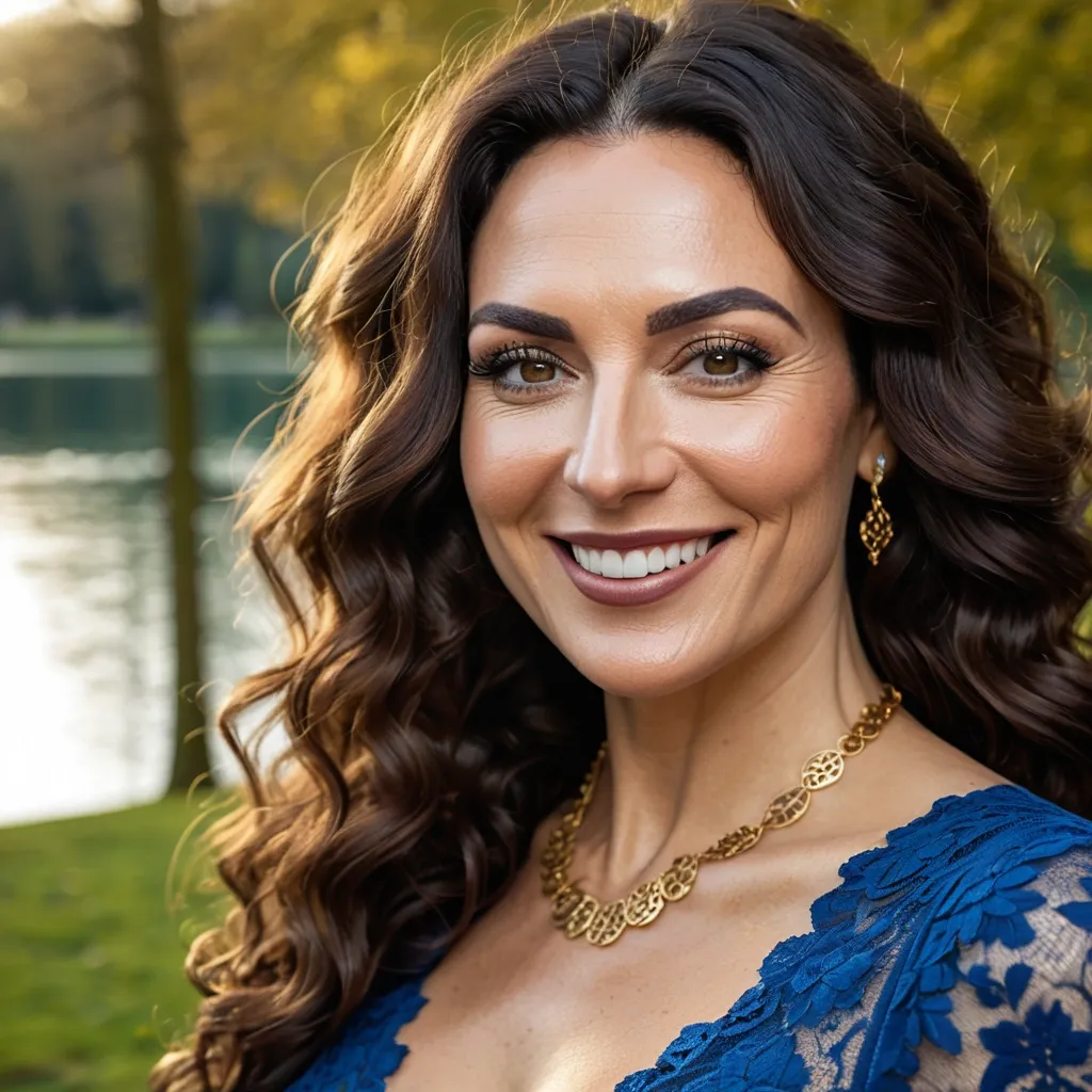 Ultra-high-definition photorealistic close-up portrait of a 34-year-old , very beautiful , brunette girl , with long , wavy and curly hair , wearing a blue lace dress and smiling confidently at the camera. Her skin is radiant and natural with a warm , approachable expression , smart make-up and a golden heavy necklace. The background depicts a soft , blurred park with trees and a lake. The lighting is bright and even , emphasizing her features and the friendly tone of the image. ,
