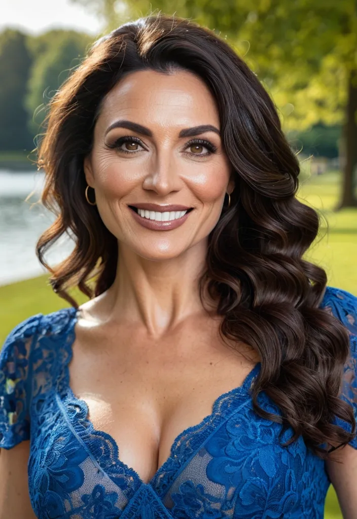 Ultra-high-definition photorealistic close-up portrait of a 34-year-old , very beautiful , brunette girl , with long , wavy and curley hair , wearing a blue lace dress and smiling confidently at the camera. Her skin is radiant and natural with a warm , approachable expression , smart make-up. The background depicts a soft , blurred park with trees and a lake. The lighting is bright and even , emphasizing her features and the friendly tone of the image. ,