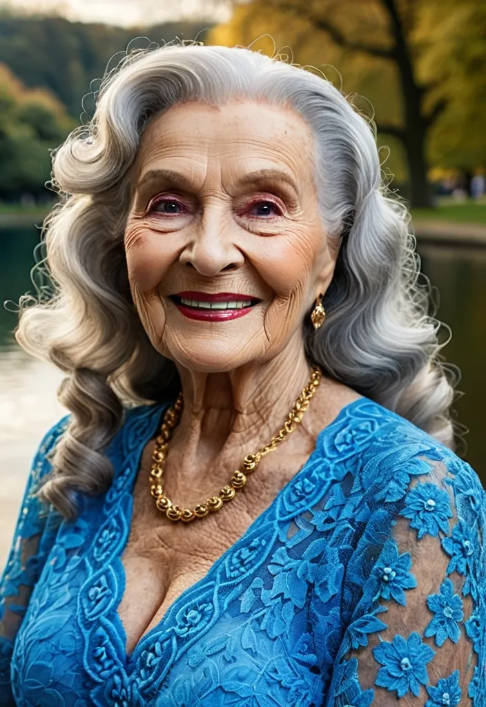 Ultra-high-definition photorealistic close-up portrait of a 95-year-old , very beautiful girl , with long , wavy and curly hair , wearing a blue lace dress and smiling confidently at the camera. Her skin is radiant and natural with a warm , approachable expression , smart make-up and a golden heavy necklace. The background depicts a soft , blurred park with trees and a lake. The lighting is bright and even , emphasizing her features and the friendly tone of the image. ,