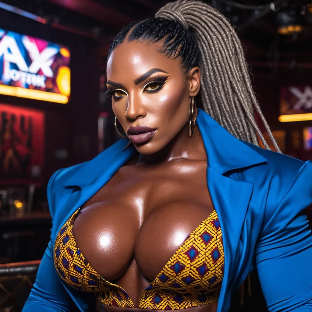 Generate Gorgeous female boss , bimbo , dark-skinned African-American female , hourglass body , abnormally massive female bodybuilder , gorgeous , close up , full lips , big booty , brown , on face and breast , dreadlocks , ponytail , feminine silhouette , too big breast , big booty , sexy thighs abs , silhouette , up close , flexing biceps , gorgeous hazel eyes , legs are iconic and defining physical feature , both visually and in terms of combat ability.wearing an outfit that is a striking blend of elegance , power , and femininity , designed to command attention in any room. The suit is tailored to perfection , hugging the wearer’s curves with precision while emphasizing a structured silhouette. The fabric itself is a refined grey tweed patterned with subtle white grid lines , giving the suit a texture that feels both sophisticated and modern. The blazer features broad blue lapels and gold button accents , adding a luxurious touch that elevates the look beyond typical business attire. The matching high-waisted trousers elongate the frame , further enhancing the poised and commanding effect of the ensemble.The styling choices amplify the boldness of the suit. The inner blouse is a silky , greybutton-down shirt that complements the tweed’s tone while introducing a softer , feminine balance to the sharp tailoring of the jacket. The blouse peeks out neatly from under the blazer , maintaining elegance without drawing focus away from the suit’s commanding cut. Accessories are kept minimal yet intentional: a delicate layered gold necklace and hoop earrings that add glimmers of light and luxury without overpowering the outfit. The choice of voluminous , honey-brown braids cascading down her shoulders frames the face with both confidence and glamour , completing the commanding visual.Altogether , this look communicates a blend of authority and allure. It is business-ready yet fashion-forward , balancing corporate structure with vibrant femininity. The color palette blue , grey and gold avoids being overly delicate , instead embracing the richness of texture , structure , and presence. This is the kind of ensemble that speaks to ambition , sophistication , and personal style—ideal for someone who thrives in positions of influence but insists on expressing her individuality with bold elegance. It’s not just clothing—it’s a statement of power wrapped in grace. In luxury living legs that could crush a watermelon , skirt high boots are a bold and striking statement piece , crafted in glossy black patent leather that gives them a sleek , polished finish. Rising to just below the knee , the boots feature three adjustable buckle straps along the shaft , adding both edge and detail to their design. The towering stiletto heel , paired with a thick platform sole , creates an ultra-dramatic silhouette that elongates the leg and exudes power and confidence. With their combination of shine , height , and structure , these boots perfectly balance fierce femininity with high-fashion allure. High cheekbones , prominent jawline , gorgeous big light reflecting hazel eyes , enormous breast , in jazz clubs he is wearing a dark blue jacket draped over her shoulders , a colorful cropped top with burgundy , black , and yellow patterns that barely contains her breast ,