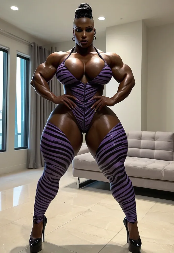 Generate a dark-skinned African-American woman , gorgeous female boss , bimbo , hourglass body , abnormally massive female bodybuilder , gorgeous , close up , full lips , big booty , black hair , braided-style-mohawk that she wears bald on the side , feminine silhouette , too big breast , big booty , sexy thighs abs , silhouette , up close , flexing biceps , beautiful light hazel eyes , legs are iconic and defining physical feature , both visually and in terms of combat ability.wearing an outfit that is a striking blend of elegance , power , and femininity , designed to command attention in any room. outfit in this image is a modern , giving it both structure and a touch of relaxed style. highlighting her curves while keeping the look balanced and versatile. Its neutral tone contrasts nicely against the blue denim , keeping the ensemble cohesive without overpowering the statement of the.Completing the polished and fashionable. Together , the outfit blends everyday comfort with bold , confident styling. This is the kind of ensemble that speaks to ambition , sophistication , and personal style—ideal for someone who thrives in positions of influence but insists on expressing her individuality with bold elegance. It’s not just clothing—it’s a statement of power wrapped in grace , Massive cleavage thunder thighs , enormous butt , muscular legs , hazel eyes , black and purple body paint tiger striped , black thong ,