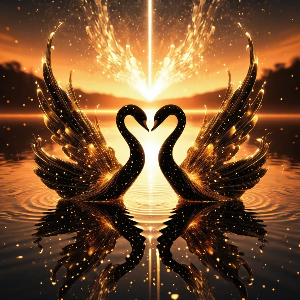 Ethereal Golden Hour: landscape Moment Melting from a sunset rendered as a Fractal ray , abstract digital art depicting , a natural , Two Feather swan , Facing , kissing , you can make a heart shape with your head and neck rendered in (dim-black dots reflecting on calm , reflective ground:1.2) , silhouetted against a breathtaking golden hour sunset that paints the sky in hues of orange , pink and gold. Style: Celestial , ethereal , abstract , digital art smoking: Dramatic backlighting , bright glowing particles , contrasting dark background Composition: dynamic diagonal composition , upward gaze Details: Sparkling white waves and smoke , streaking white light trails , sense of movement and wonder , magical atmosphere Quality: High detail , 4K , Masterpiece , Rendered in Octane ,
