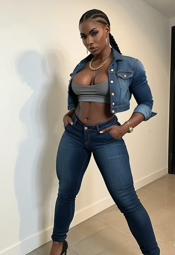 Generate a African-American woman , gorgeous female boss , bimbo , hourglass body , abnormally massive female bodybuilder , gorgeous , close up , full lips , big booty , black hair , braided design hair , bald on the side , feminine silhouette , too big breast , big booty , sexy thighs abs , silhouette , up close , flexing biceps , beautiful brown eyes , legs are iconic and defining physical feature , both visually and in terms of combat ability.wearing an outfit that is a striking blend of elegance , power , and femininity , designed to command attention in any room. outfit in this image is a modern , casual-chic look built around denim and fitted pieces. She wears a cropped denim jacket with rolled sleeves , finished with brass buttons and slightly frayed edges , giving it both structure and a touch of relaxed style. The jacket frames her upper body while leaving her midsection accentuated by the fitted layers beneath.Underneath , she pairs the jacket with a simple , tight gray crop top. The top is minimalistic yet sleek , highlighting her curves while keeping the look balanced and versatile. Its neutral tone contrasts nicely against the blue denim , keeping the ensemble cohesive without overpowering the statement of the jacket and jeans.Completing the outfit are high-waisted skinny jeans in a medium wash , tailored closely to her shape with visible seams and shading for added depth. Accessories such as layered gold necklaces , hoop earrings , and a bracelet elevate the casual denim look into something polished and fashionable. Together , the outfit blends everyday comfort with bold , confident styling. This is the kind of ensemble that speaks to ambition , sophistication , and personal style—ideal for someone who thrives in positions of influence but insists on expressing her individuality with bold elegance. It’s not just clothing—it’s a statement of power wrapped in grace. Enormous breast , enormous butt ,