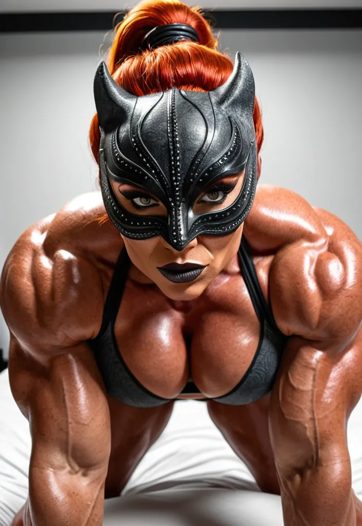 female bodybuilder , gorgeous , close up , full lips , big booty , redheaded , freckles on face and breast , braided design hair , feminine silhouette , too big breast , big booty , sexy thighs abs , silhouette , up close , flexing biceps , beautiful green eyes , legs are iconic and defining physical feature , both visually and in terms of combat ability.wearing an outfit that is a striking blend of elegance , power , and femininity , designed to command attention in any room. The suit is tailored to perfection , hugging the wearer’s curves with precision while emphasizing a structured silhouette. The fabric itself is a refined grey tweed patterned with subtle white grid lines , giving the suit a texture that feels both sophisticated and modern. The blazer features broad blue lapels and gold button accents , adding a luxurious touch that elevates the look beyond typical business attire. The matching high-waisted trousers elongate the frame , further enhancing the poised and commanding effect of the ensemble.The styling choices amplify the boldness of the suit. The inner blouse is a silky , greybutton-down shirt that complements the tweed’s tone while introducing a softer , feminine balance to the sharp tailoring of the jacket. The blouse peeks out neatly from under the blazer , maintaining elegance without drawing focus away from the suit’s commanding cut. Accessories are kept minimal yet intentional: a delicate layered gold necklace and hoop earrings that add glimmers of light and luxury without overpowering the outfit. The choice of voluminous , honey-brown braids cascading down her shoulders frames the face with both confidence and glamour , completing the commanding visual.Altogether , this look communicates a blend of authority and allure. It is business-ready yet fashion-forward , balancing corporate structure with vibrant femininity. The color palette blue , grey and gold avoids being overly delicate , instead embracing the richness of texture , structure , and presence. This is the kind of ensemble that speaks to ambition , sophistication , and personal style—ideal for someone who thrives in positions of influence but insists on expressing her individuality with bold elegance. It’s not just clothing—it’s a statement of power wrapped in grace. In luxury living legs that could crush a watermelon , skirt high boots are a bold and striking statement piece , crafted in glossy black patent leather that gives them a sleek , polished finish. Rising to just below the knee , the boots feature three adjustable buckle straps along the shaft , adding both edge and detail to their design. The towering stiletto heel , paired with a thick platform sole , creates an ultra-dramatic silhouette that elongates the leg and exudes power and confidence. With their combination of shine , height , and structure , these boots perfectly balance fierce femininity with high-fashion allure. muscular body builder woman , abnormally massive woman , enormous breast , enormous buttShe is leaning forward with her elbows likely resting on a surface , causing her upper body to tilt toward the viewer. Her scowl expression on her face. The low-cut top emphasizes her posture , drawing attention to her chest as she gazes directly ahead. Squeezing her breast together , on bed , in a bedroom enough butt , Enormous breast , arched back profile side view , scowl on face , light hazel eyes , big juicy round booty , arched back booty up high , enormous butt , scowl on face , profile shot black and grey feline mask and feline paint ,