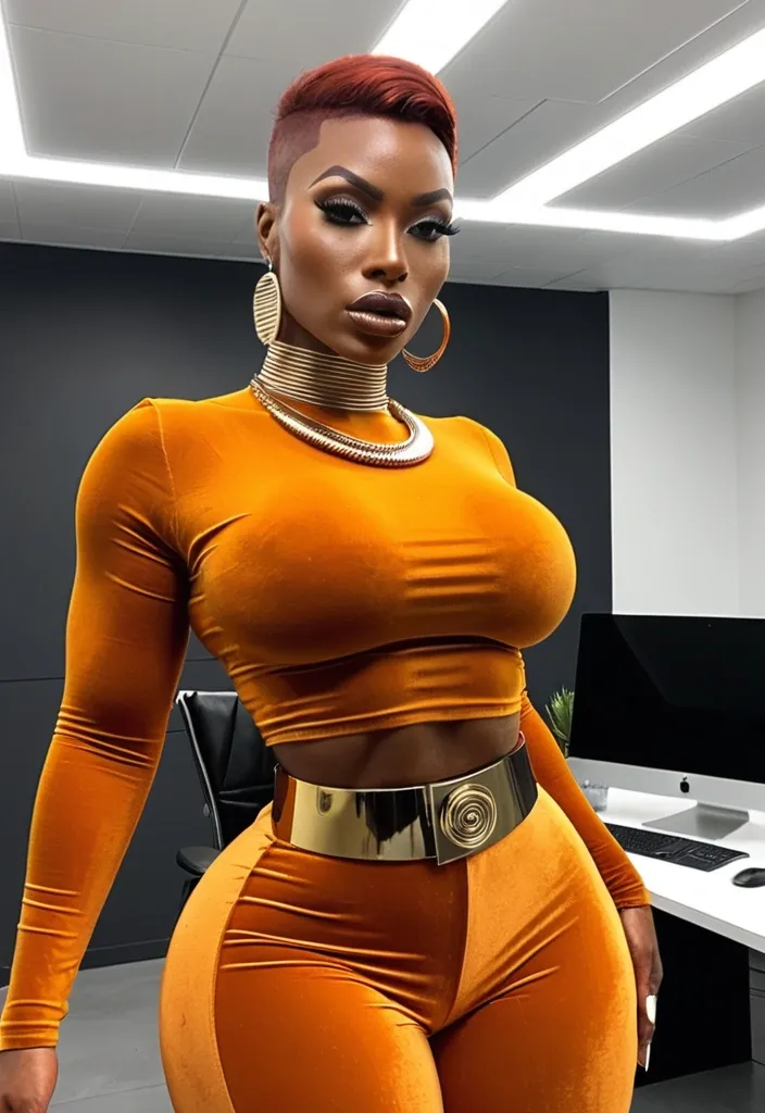 Generate Gorgeous 24 years old , female boss , dark-skinned African-American woman , pointy face , bimbo , hourglass body , abnormally massive female bodybuilder , gorgeous , close up , full lips , big booty , short stylish pixie hair cut futuristic mini afro , feminine silhouette , too big breast , big booty , sexy thighs abs , silhouette , up close , flexing biceps , beautiful brown eyes , legs are iconic and defining physical feature , both visually and in terms of combat ability.wearing an outfit that is a striking blend of elegance , power , and femininity , designed to command attention in any room. The suit is tailored to perfection , hugging the wearer’s curves with precision while emphasizing a structured silhouette. The fabric itself is a refined grey tweed patterned with subtle white grid lines , giving the suit a texture that feels both sophisticated and modern. The blazer features broad blue lapels and gold button accents , adding a luxurious touch that elevates the look beyond typical business attire. The matching high-waisted trousers elongate the frame , further enhancing the poised and commanding effect of the ensemble.The styling choices amplify the boldness of the suit. The inner blouse is a silky , greybutton-down shirt that complements the tweed’s tone while introducing a softer , feminine balance to the sharp tailoring of the jacket. The blouse peeks out neatly from under the blazer , maintaining elegance without drawing focus away from the suit’s commanding cut. Accessories are kept minimal yet intentional: a delicate layered gold necklace and hoop earrings that add glimmers of light and luxury without overpowering the outfit. The choice of voluminous , honey-brown braids cascading down her shoulders frames the face with both confidence and glamour , completing the commanding visual.Altogether , this look communicates a blend of authority and allure. It is business-ready yet fashion-forward , balancing corporate structure with vibrant femininity. The color palette blue , grey and gold avoids being overly delicate , instead embracing the richness of texture , structure , and presence. This is the kind of ensemble that speaks to ambition , sophistication , and personal style—ideal for someone who thrives in positions of influence but insists on expressing her individuality with bold elegance. It’s not just clothing—it’s a statement of power wrapped in grace. In luxury living legs that could crush a watermelon , skirt high boots are a bold and striking statement piece , crafted in glossy black patent leather that gives them a sleek , polished finish. Rising to just below the knee , the boots feature three adjustable buckle straps along the shaft , adding both edge and detail to their design. The towering stiletto heel , paired with a thick platform sole , creates an ultra-dramatic silhouette that elongates the leg and exudes power and confidence. With their combination of shine , height , and structure , these boots perfectly balance fierce femininity with high-fashion allure. High cheekbones , prominent jawline , gorgeous big brown light hazel honey , dark red hair , enormous breast , orange velvet t-shirt , gold futuristic necklace , grey designer pants in office building ,