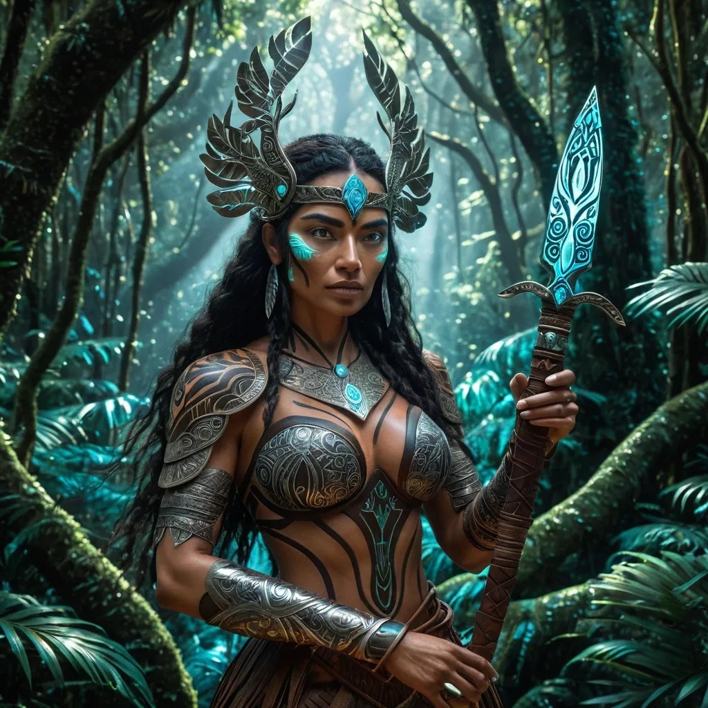 A forest spirit , embodying the ancient wisdom of the Amazon rainforest , a Moana (daughter of chief Tui , embarks on a journey to return the heart of goddess Te Fitti from Maui) , emerges from a canopy of glowing flora. Her skin is patterned with intricate , bioluminescent markings , she holds a short Greek sword of polished steel with a brown leather-wrapped hilt , reflecting pale celestial light. On her left forearm , a silver-golden shield engraved with intricate patterns is securely strapped with two leather bands , and her eyes hold the depth of ancient trees. The scene is rendered with hyperrealistic detail , infused with a dreamlike , abstract quality , channeling the mystical forest imagery of Hayao Miyazaki and the concept art style of James Gurney. ,
